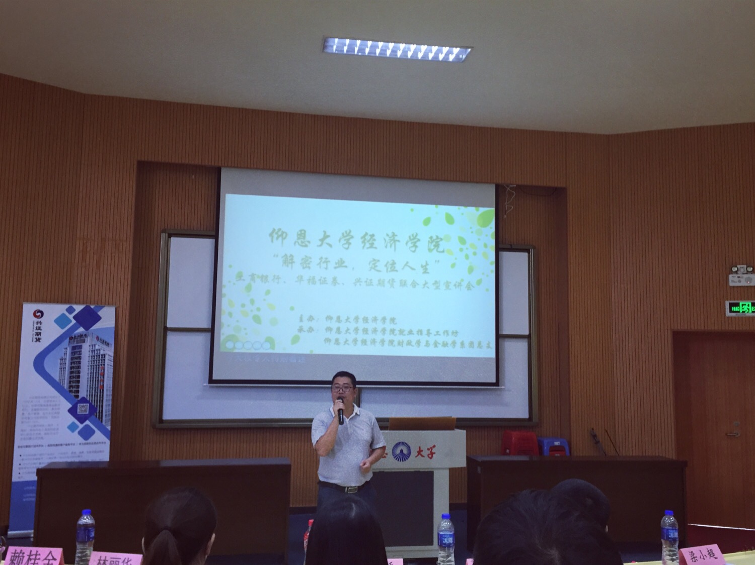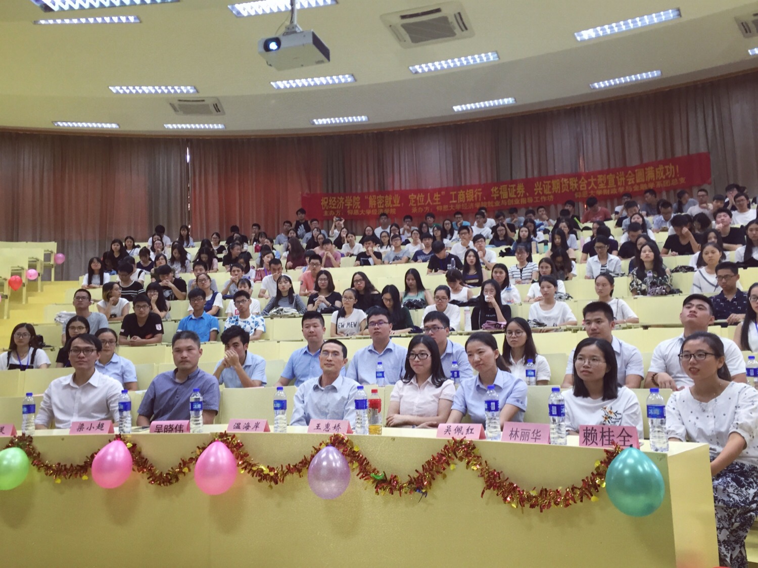 活动一开始,吴晓伟向同学们阐明了本次活动的积极意义,并希望同学们都能积极求职能够有所收获。会上,温海岸副行长以工商银行的入职条件为切入点,与同学们分享了对银行就业的一些看法;华福证券讲师许振灵为同学们详细介绍证券公司,并分享自身在工作上的心得和经验;兴证期货讲师王惠娇深入浅出讲述关于期货的一些知识,引发同学兴趣,由此鼓励同学们多了解期货行业。活动期间同学们兴致高涨纷纷向各位嘉宾提问,华福证券以及兴证期货两家公司进行了现场招聘,本次活动圆满落幕。