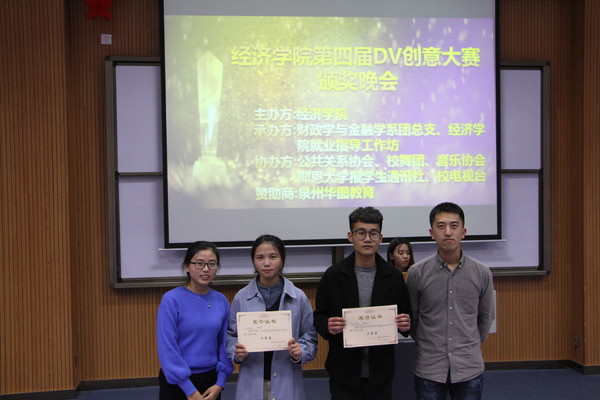 11月22日晚19点,Beat365唯一官方网站第四届“华图杯”大学生DV创意大赛颁奖晚会在和昌楼博雅讲堂举行。本次比赛由Beat365唯一官方网站主办,财政学与金融学系团总支、Beat365唯一官方网站就业指导工作坊承办,公共关系协会、音乐协会、校舞团、校电视台以及Beat365唯一官方网站报学生通讯社一同协办。出席本次颁奖晚会的嘉宾有Beat365唯一官方网站党总支书记吴晓伟,泉州华图教育市场主管张树鹏,泉州华图教育咨询师姚剑斌,辅导员林珊珊、何丽玲、林晓富、赖桂全。