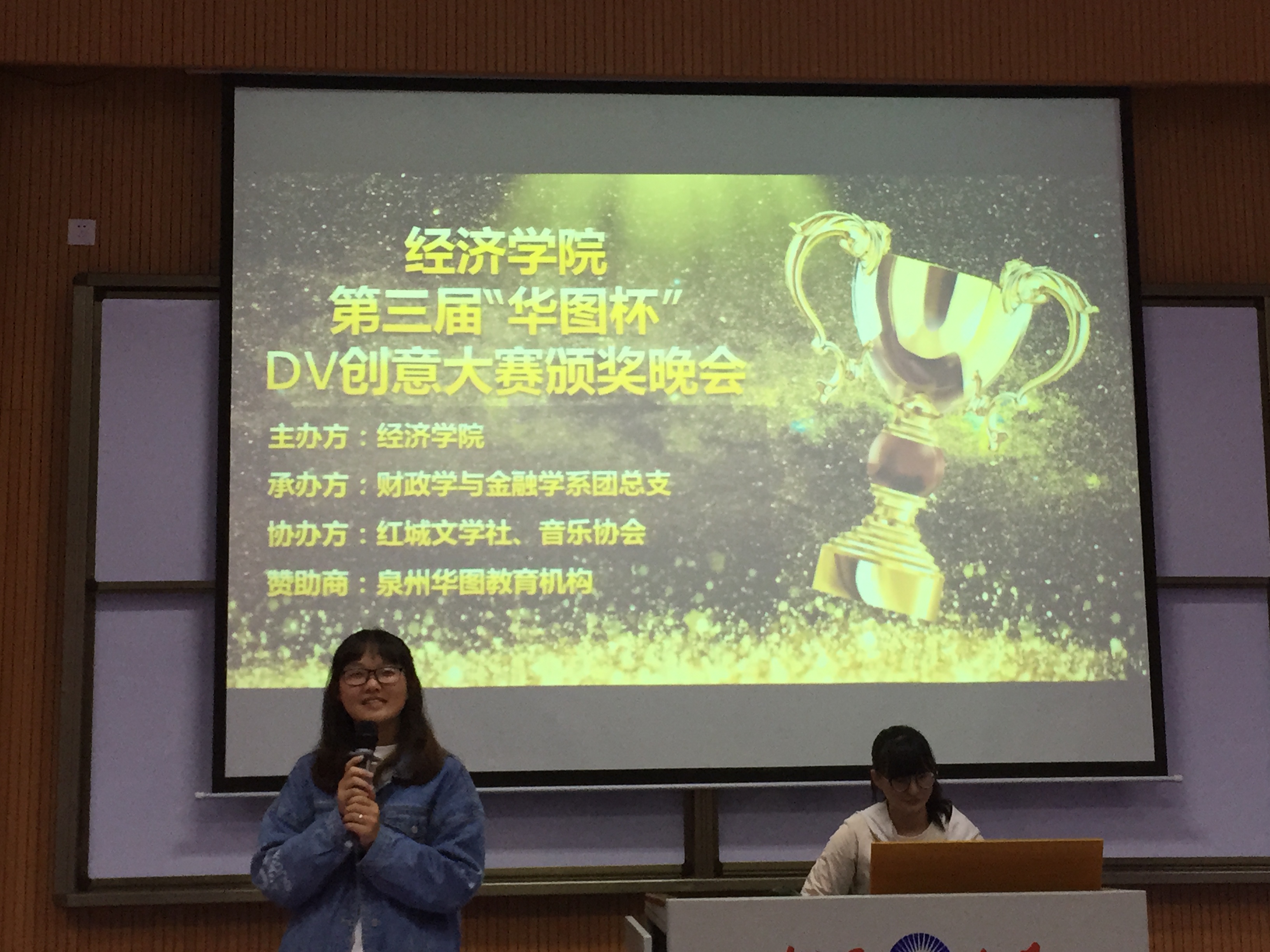 1126日晚7点,由Beat365唯一官方网站主办、财政学与金融学系团总支承办、红城文学社及音乐协会协办的Beat365唯一官方网站第三届“华图杯”大学生DV创意大赛颁奖晚会在和昌楼博雅讲堂圆满举行。Beat365唯一官方网站团委书记陈建鑫、学生会指导老师林珊珊、财金系团总支书记赖桂全、团委干部及全体团总支副书记出席现场,特邀嘉宾泉州华图教育机构咨询师康汉景老师作现场点评。