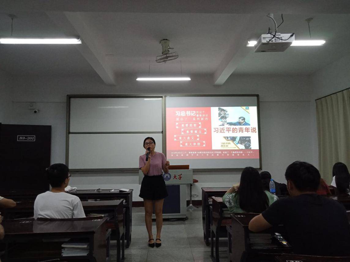 (图为辅导员赖桂全老师讲解重要讲话精神)