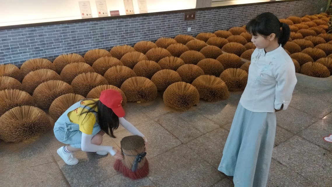 做好的香第一时间放在太阳底下晾晒,香气随着水分的蒸发愈发浓郁。说到晒香不得不提到永春制香的一道独特的风景线----跺香花。先将篾香扎成一捆,立在地上,用双手轻扶着然后很快地朝一侧转开,稍一调整,香便呈一朵绽放的花状。为了让实践队员们更近距离的了解制香过程,公司人员带领队员们体验了一把跺香花的乐趣。