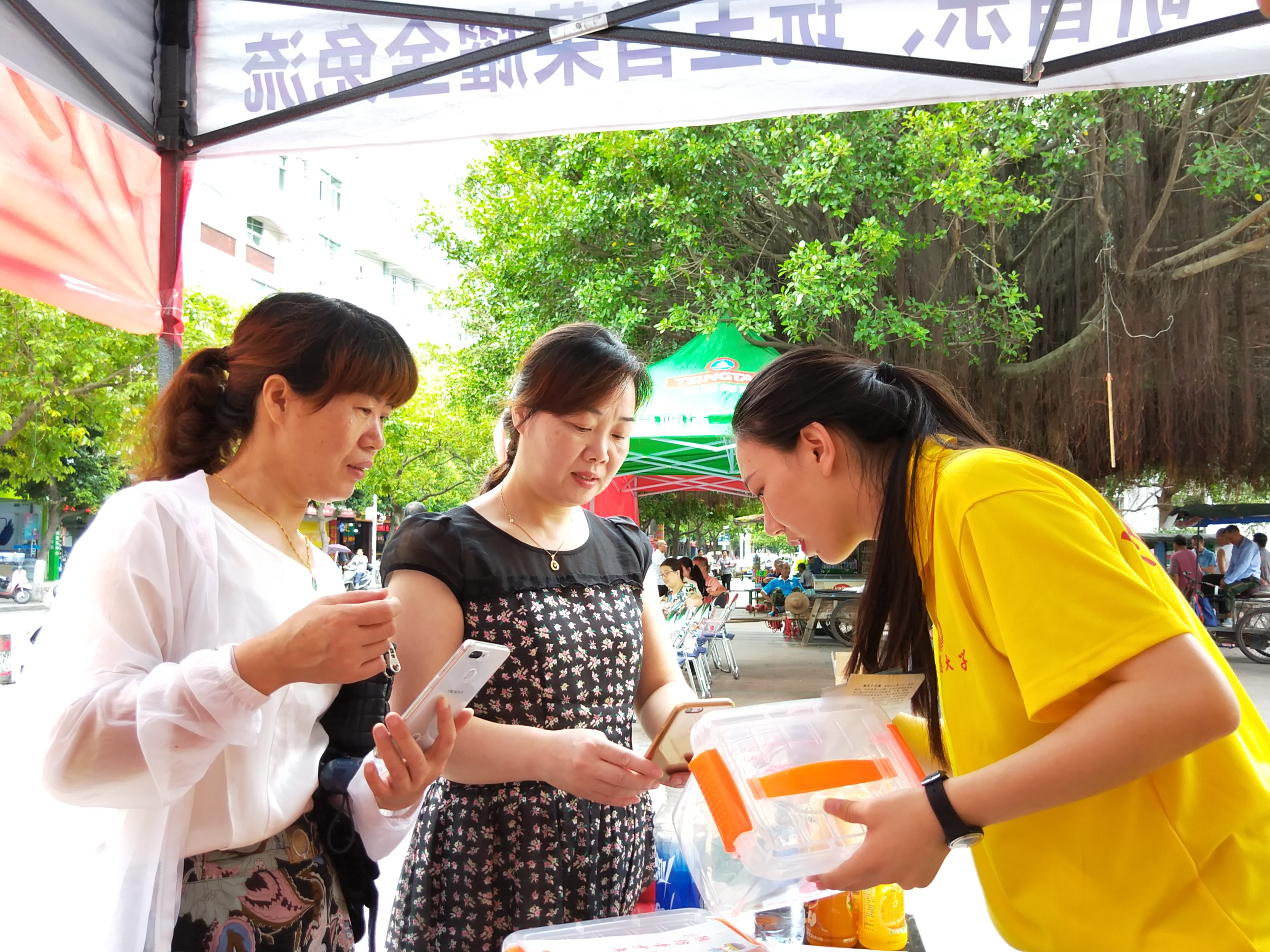 在文化广场上设立服务站分发宣传册和禁毒宣传的纪念品。实践队伍分为两个部分,8名实践队员到街上分发宣传册,另外8名队员在站点进行讲解禁毒内容和分发纪念品。在领取禁毒纪念品前,需要领取人扫码关注共青团霞浦县委员会,了解更多禁毒知识,让霞浦人民参与到禁毒工作。与此同时,共青团县委也安排了宁德师范学院绿色环保何禹暑期实践队在此地宣传保护水资源。在此期间,两支队伍进行了禁毒知识与保护水资源的内容交流以及分享实践的经验,并互相鼓励,合影留恋。