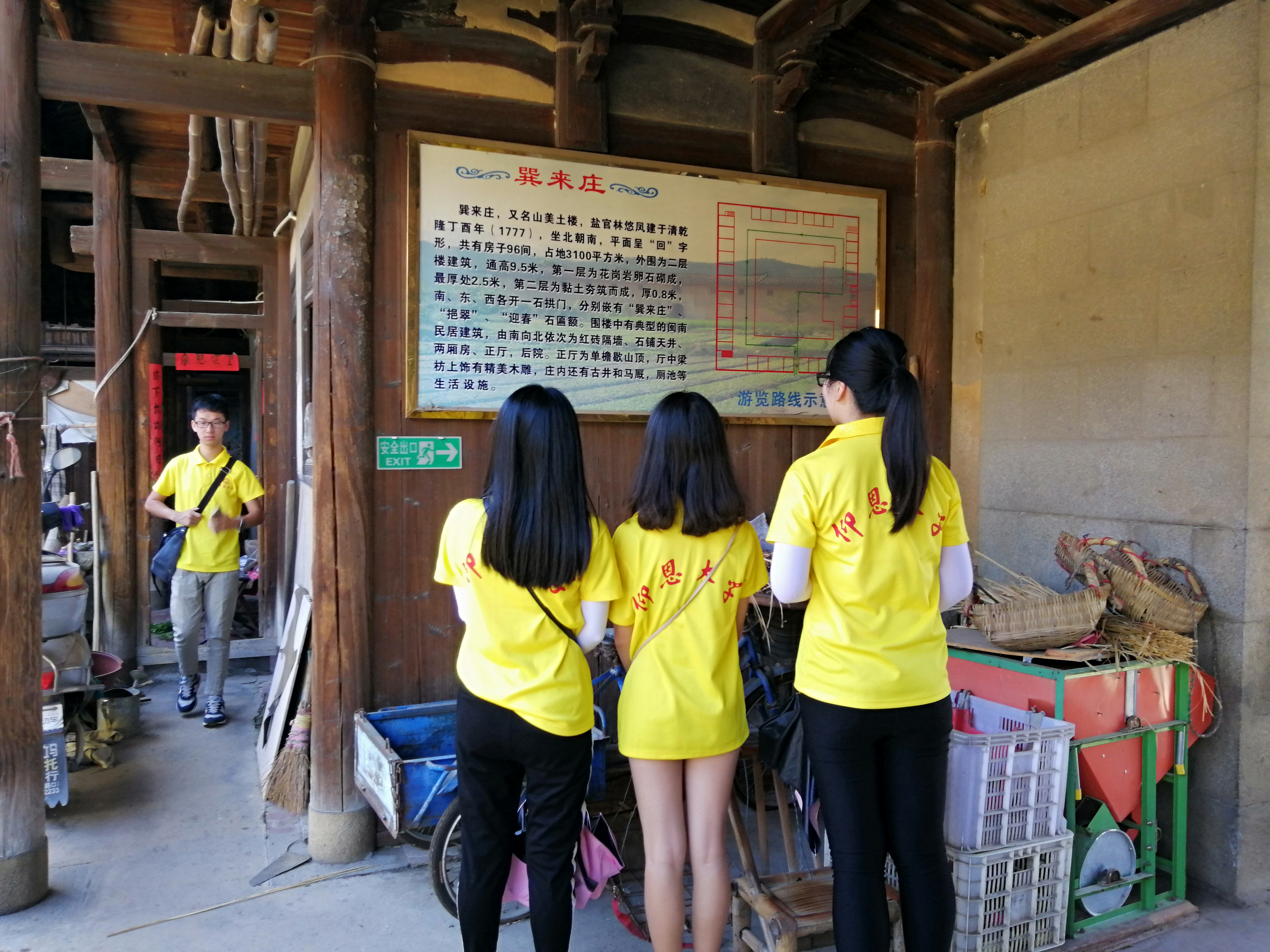 实践期间,实践队员对土楼开展调查。土楼至今保存基本完好,在大门处,嵌一块石牌匾,上面写着“巽来庄”,两侧还刻有“乾隆丁酉”、“三秋吉立”,由此看出土楼历史悠久、年代久远。实践队员触摸土楼斑驳的外墙,感受到旧时匠人的巧夺天工,将朴实的泥土构筑成迷人的风景。