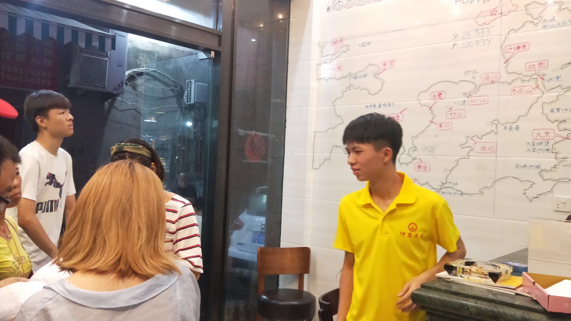 由于天气原因,实践队将义卖分为两次进行。前期,准备了动物图案的气球以及各式各样的干花。实践队进行分工,男生搭帐篷、搬运桌子以及为气球充气,女生进行干花的裁剪,以及气球的固定。实践队租了音响和麦克风,在音乐的感染力下,吸引了不少的群众围观和购买义卖商品。在得到每一笔善款时,实践队都会告知买者,筹募的资金将用来转换物资,慰问当地的贫困户。义卖结束后,实践队到“不舍客栈”进行义工,帮忙打扫楼梯和擦扶梯。同时,实践队员为旅客讲解了当地的旅游地点及特色。