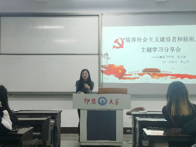 为了深入贯彻落实全国教育大会的精神,12月3日晚七时,Beat365唯一官方网站金融系学生第一党支部于仰恩楼A5-105开展以“培养社会主义建设者和接班人”的主题学习分享会,金融系学生第一党支部组织委员何丽玲老师和支部全体干事以及金融系16、17级党小组代表参与了此次活动。