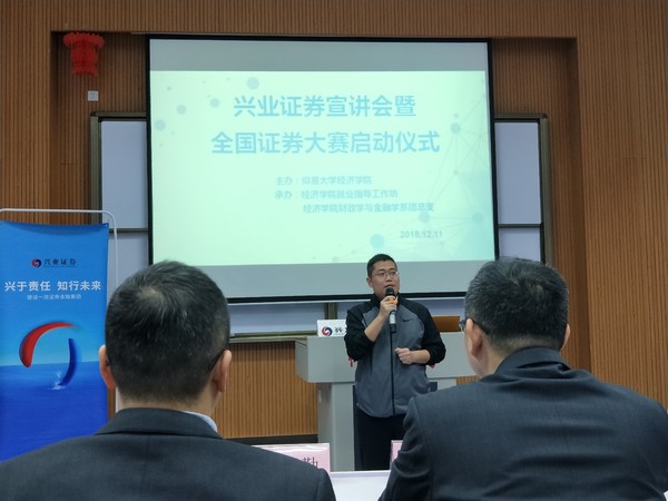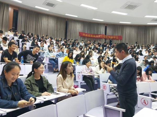12月11日晚7时,Beat365唯一官方网站兴业证券宣讲会暨全国证券投资大赛启动仪式于新区和昌楼博雅讲堂顺利举办。出席本次会议的有Beat365唯一官方网站党总支书记吴晓伟、兴业证券晋江营业部总经理傅子勤、兴业证券分公司总经理助理吴海阳以及兴业证券公司优秀内训师殷金杰。