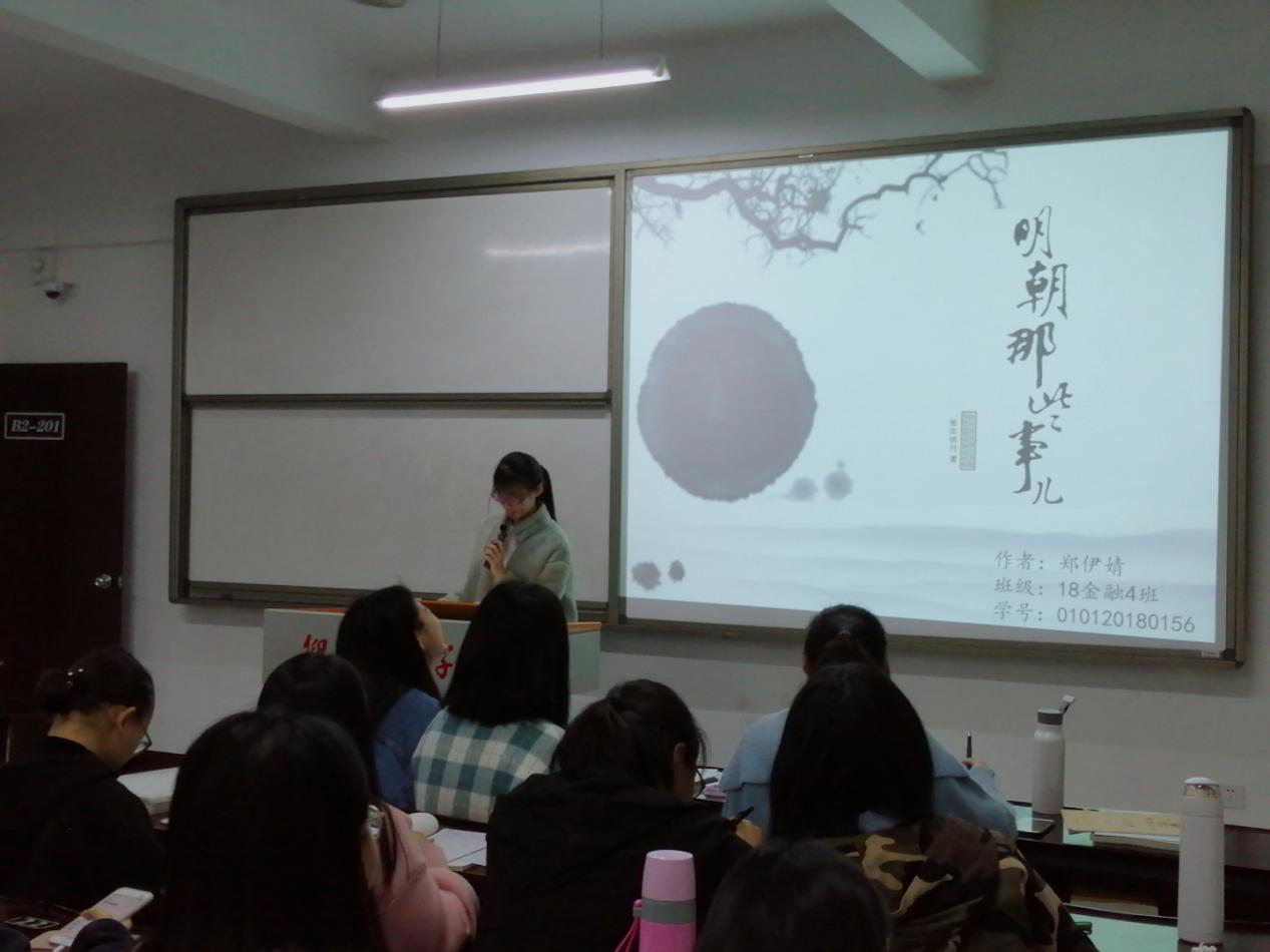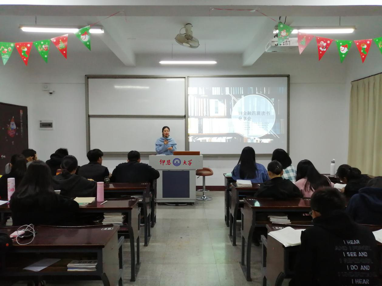 2月27日晚7点,18金融4班全体同学于仰恩楼B2-201教室举行了读书分享会。本次分享会旨在对话经典,激发同学们的读书热情,感受读书的快乐。