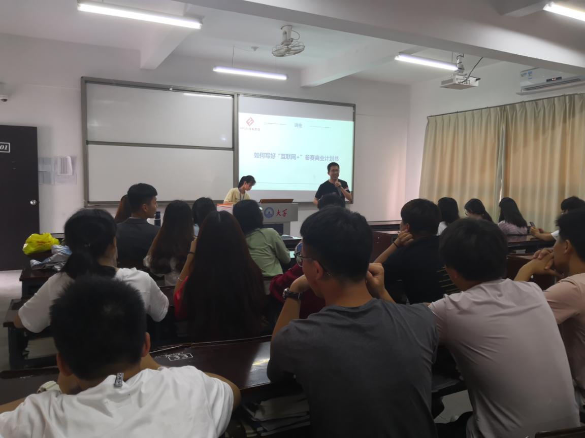 (图为褚锦灿老师讲解创业计划书注意事项)
