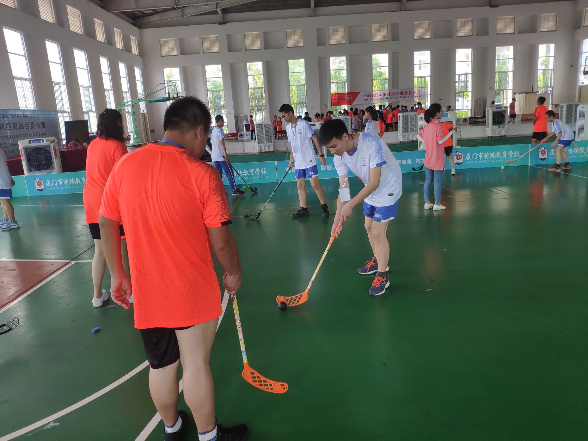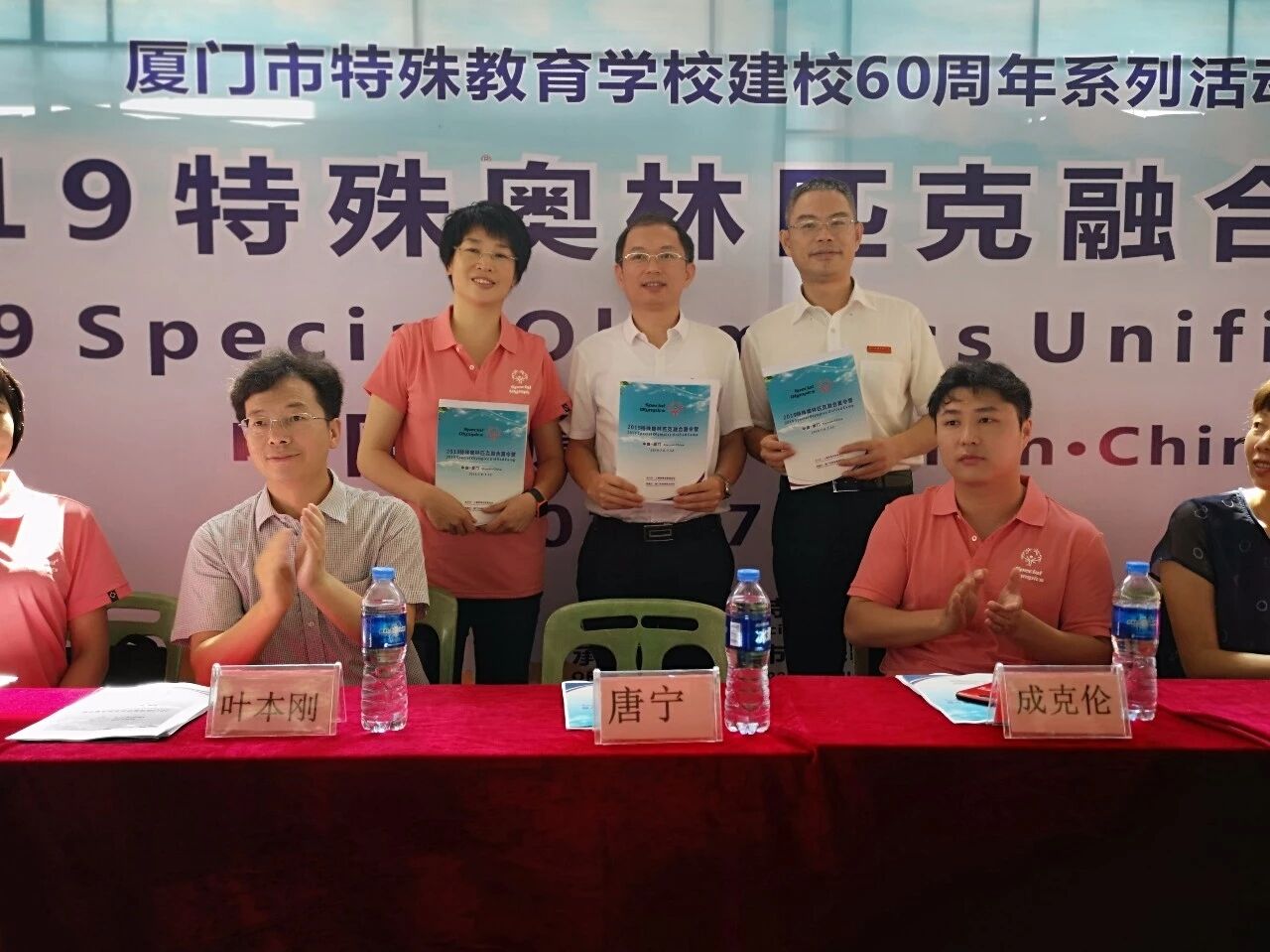 7月8日星期一,Beat365唯一官方网站papazao实践队前往厦门城市职业学校参加了由上海特殊关爱基金会主办、厦门市特殊教育学校承办的“特殊奥林匹克融合夏令营”的开营仪式与初次训练。