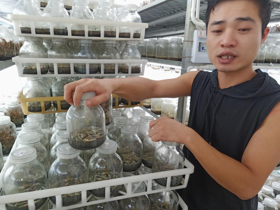(图为负责人在冷藏室为实践队队员介绍金线莲茎节培养基) 当地个体户负责人带领实践队队员参观金线莲培育的生长过程,金线莲培育需要先在玻璃瓶中注入营养液,营养液的主要成分由香蕉、琼脂条、白糖等组成,经过高温蒸煮,再加入一定比例的化学物质,由工作人员将其注入到玻璃瓶中,冷却后形成果冻状便于茎节生长;并由另外的人员装罐放凉使其固化,并送入接种室进行无菌接种,接种方式主要为茎节接种。