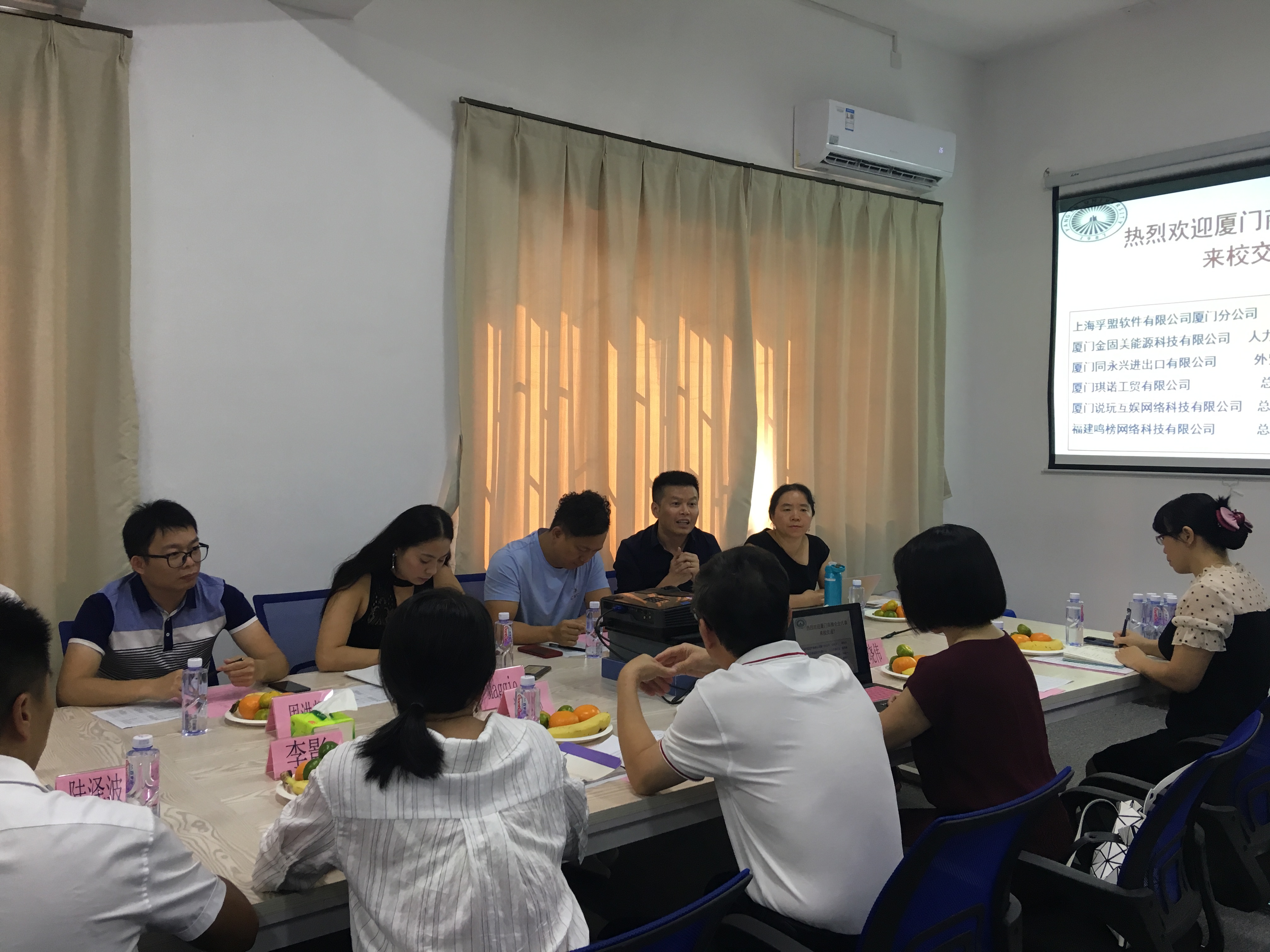 2019年9月24日,Beat365唯一官方网站牵头举办厦门商圈深化校企合作对接交流会。教务部主任郑兆领及Beat365唯一官方网站、工程技术学院相关人员与上海孚盟软件有限公司厦门分公司总经理邱河川、厦门琪诺工贸有限公司总经理陈鲤宁、厦门金固美能源科技有限公司人力资源总监周洪辉、厦门同永兴进出口有限公司外贸部总监Maggie、厦门说玩互娱网络科技有限公司总经理苏炳灵、福建鸣榜网络科技有限公司总经理高钊颖等一行十人企业代表进行座谈,校企双方就企业创新发展中的人才需求与高校应用型转型对实践教学资源的需求等问题进行共同探讨。