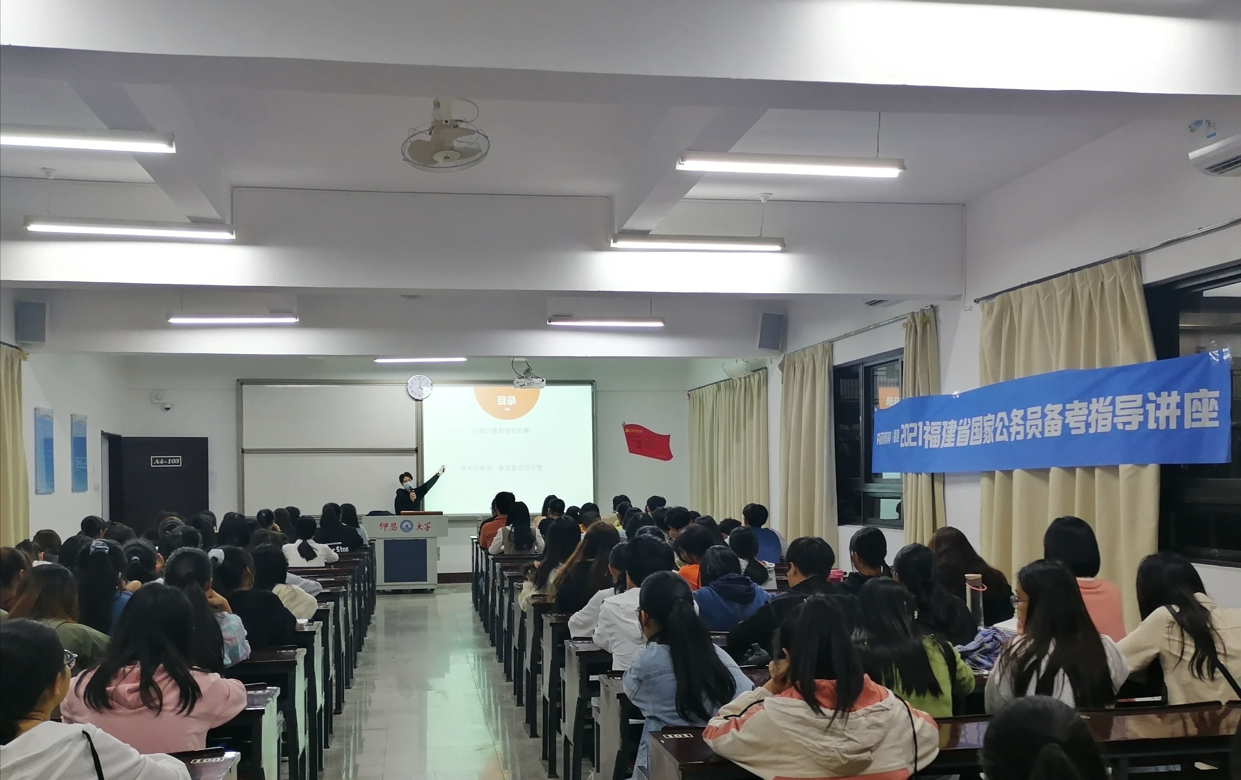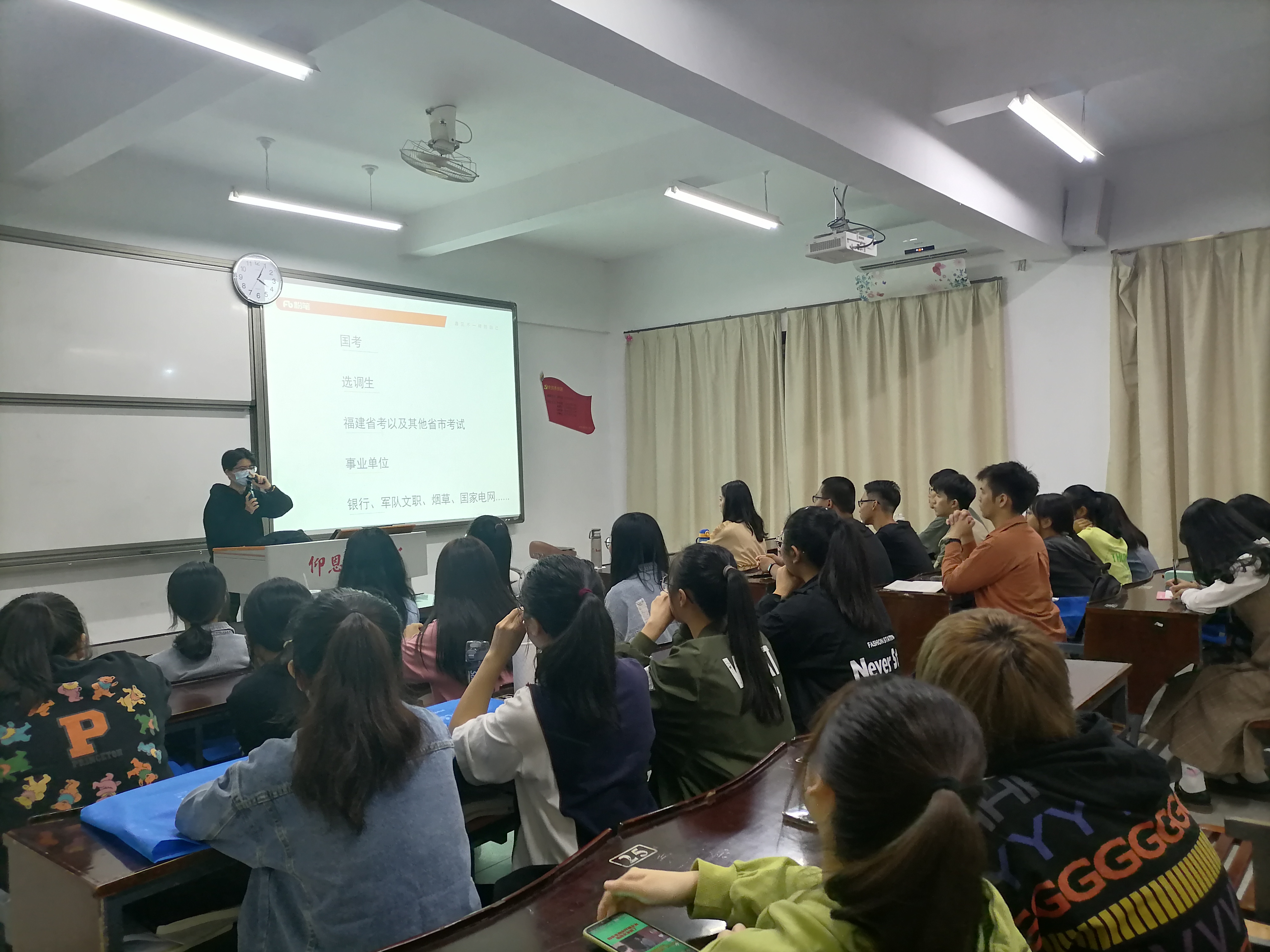 讲座伊始,陈悦莉老师介绍了公务员考试的基本常识,并着重讲解了行政能力测试和申论考试中应认真注意的重点与简单有效的解题技巧。紧接着,陈老师向同学们介绍2021年国家公务员招考的基本趋势与各类岗位之间的区别,帮助同学们对于国家公务员有更深程度的了解。最后,陈老师结合自身经验与在场同学互动交流,详尽解答同学们提出的问题,同学们表示受益匪浅,送上阵阵热烈的掌声。