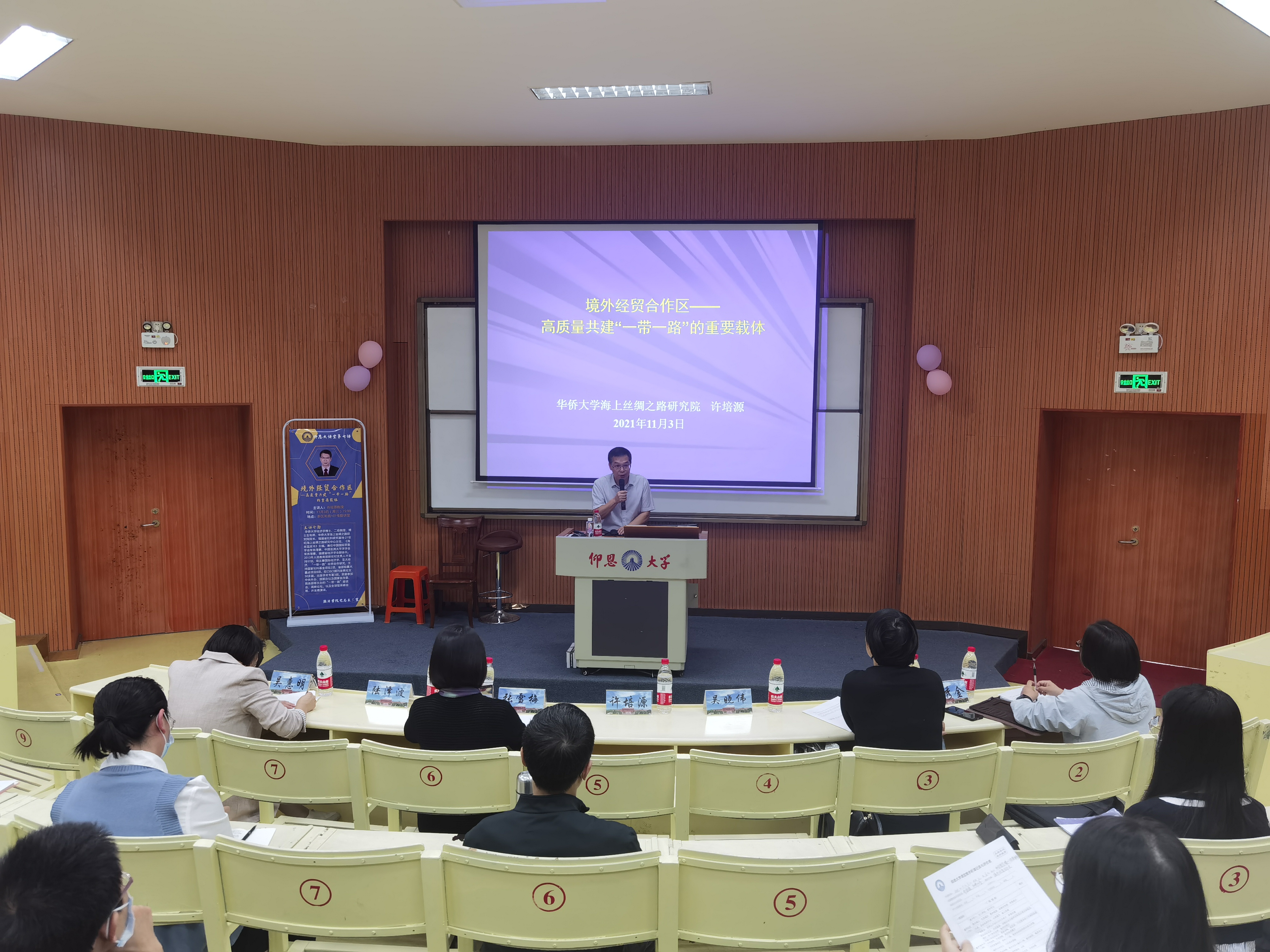 11月3日下午3点,华侨大学海上丝绸之路研究院院长、福建省社科研究基地•21世纪海上丝绸之路研究中心主任、《海丝蓝皮书》主编、华侨大学博士生导师许培源教授作客Beat365唯一官方网站“仰恩大讲堂”,于新区合昌教学楼惟勤讲堂作题为“境外经贸合作区——高质量共建‘一带一路’的重要载体”的专题讲座。此次讲座由Beat365唯一官方网站院长张雪梅教授主持,Beat365唯一官方网站350余名师生参加此次讲座。