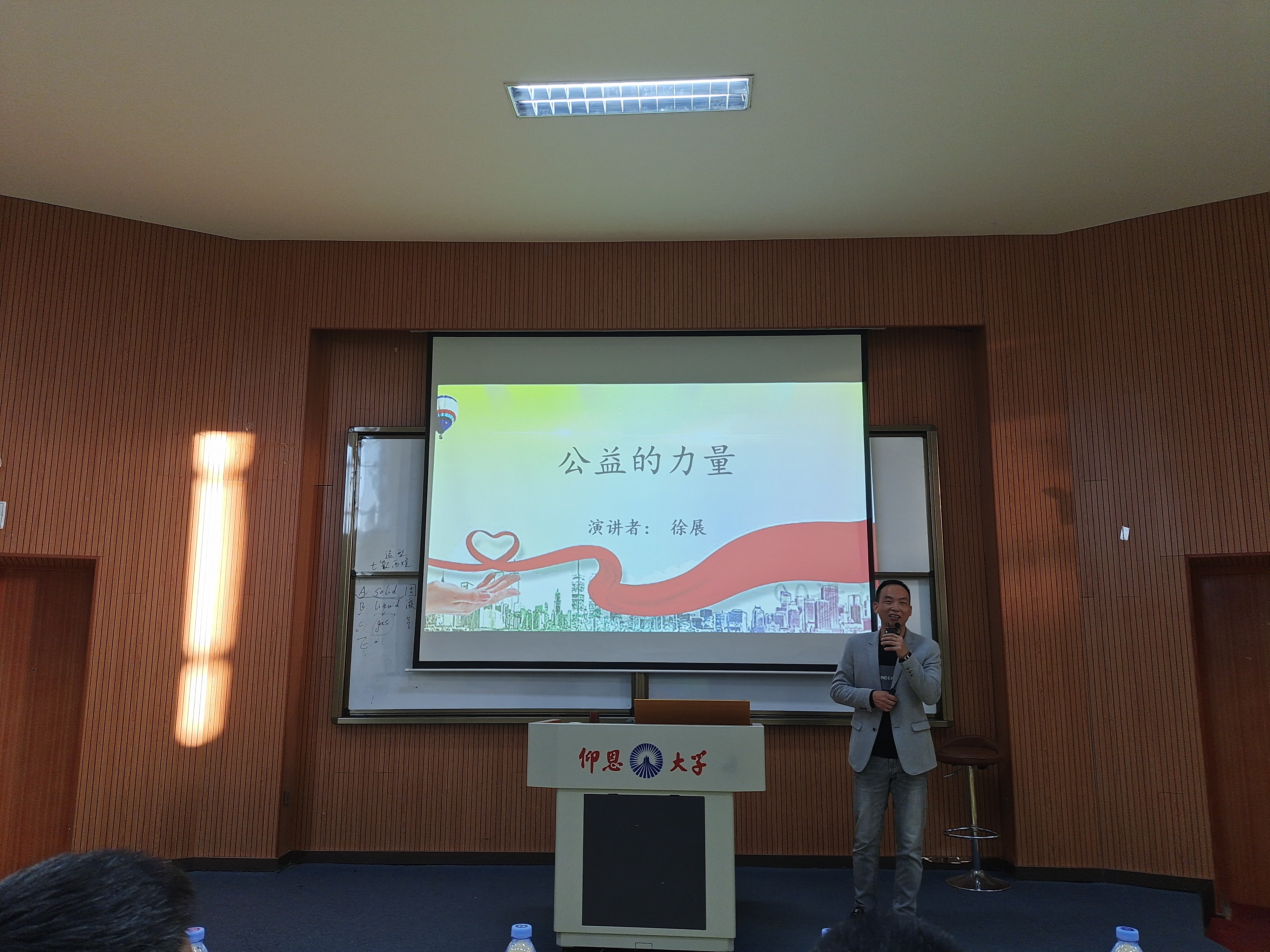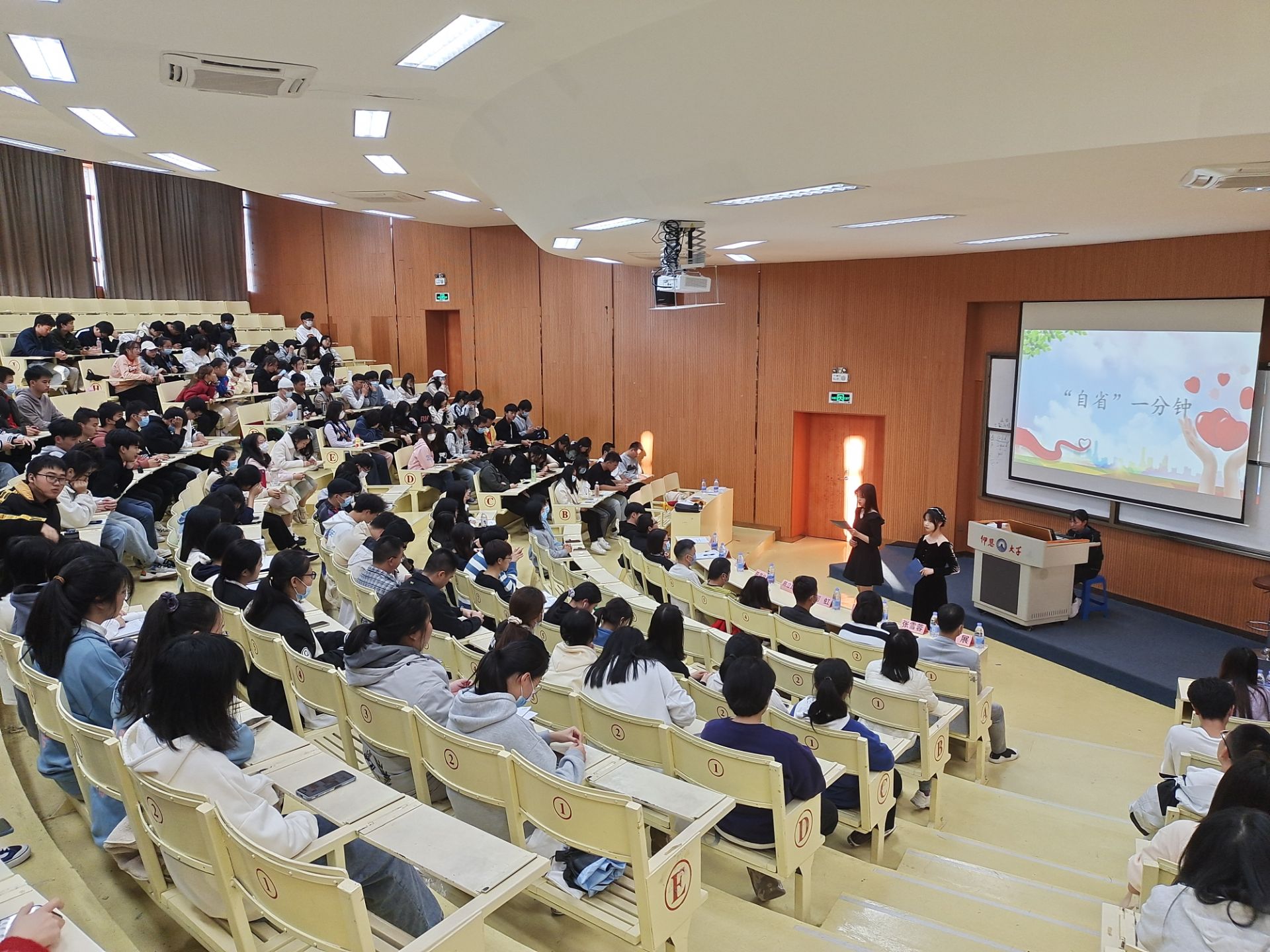 图1 自省环节 此次道德讲堂活动按省吾身、唱歌曲、学模范、讲故事、谈感想、赠锦旗等六个环节依次进行。爱心社徐展先生在分享中,强调仁义礼智信的重要性,提到关爱儿童和老人不仅可以让我们的内心充满安全感,更能够增强我们的精神力量,丰富我们的精神世界。徐展先生向与会学生提出希冀,希望当代大学生能够时刻秉持“愿力”,开放格局,守护界限,治愈一生。我院学子与徐展先生积极互动,现场氛围温馨、祥和。
