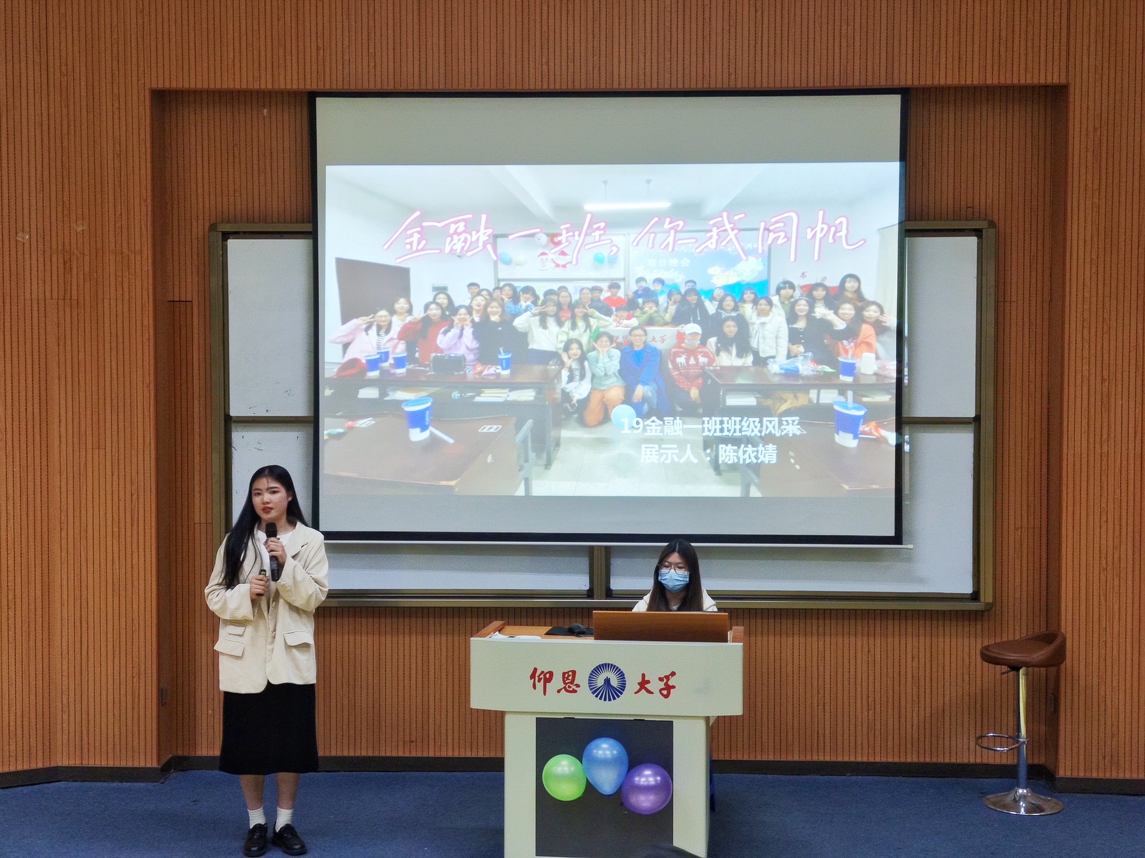 图1 学生进行班级介绍 首先由主持人主持召开班级风采大赛。各参赛班级以丰富的内容、多样的形式向与会师生展示班级风采。各参赛班级通过丰富的PPT展示,展现出积极向上的班风学风和丰富多彩的班级活动,绽放着在一次次激烈讨论中衍生的班级凝聚力、在一次次的排练、训练中取得的累累硕果、在一次次团结合作中共创的集体荣誉,在别出心裁的短片、唱歌、舞蹈、演讲等表演中更是炫出别样的班级文化,将现场的气氛一次又一次点燃。