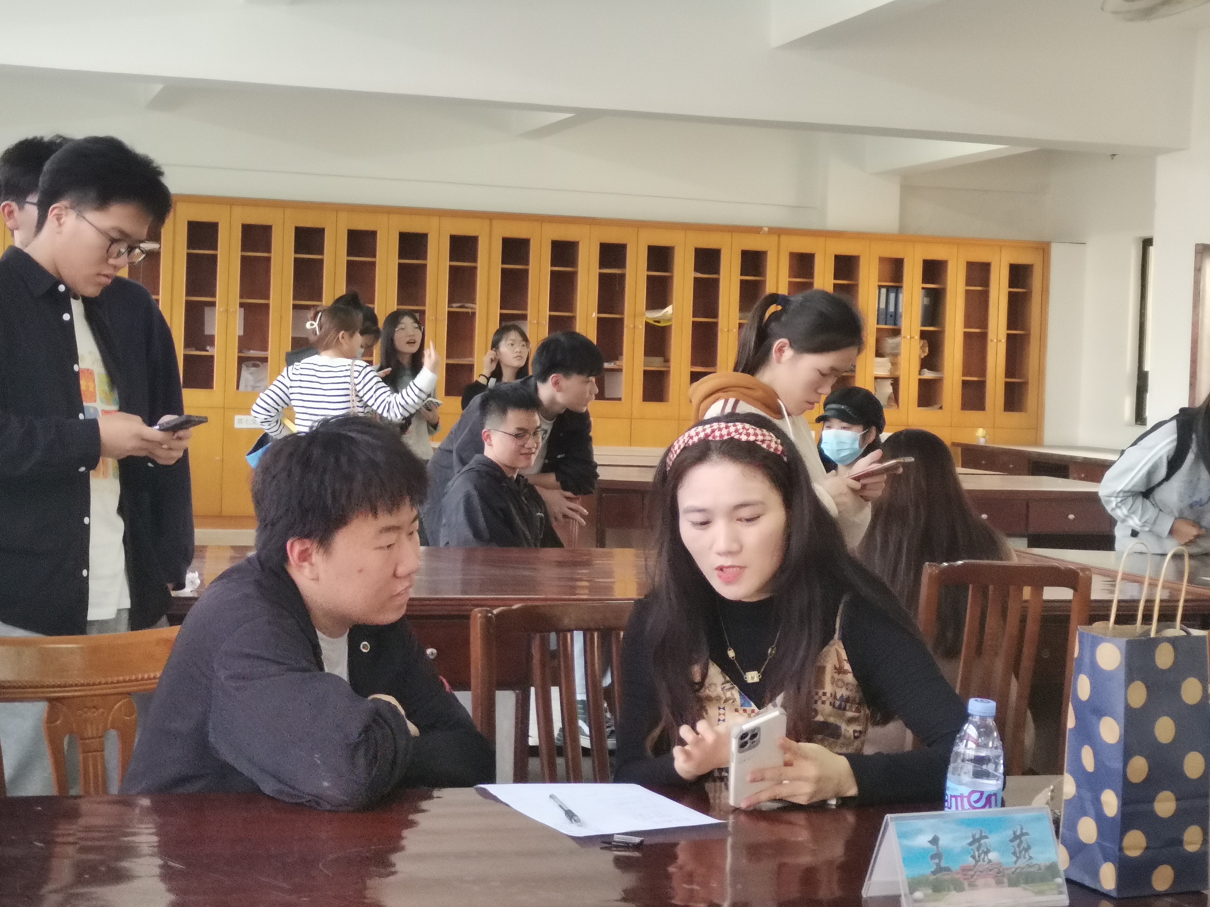 图1 同学提问 本次活动设有学习及考研答疑区域和发展与就业答疑区域两个区域。各位老师根据每个学生的情况结合自身经历为同学们答疑解惑,主要针对考研、专业学习、就业以及学院工作等方面。在解答所有学生的疑虑时,老师一方面鼓励学生们学习要趁早,给学生鼓足劲,加足油,使其一心投入学习当中去。另一方面打消了部分学生摇摆不定的心态,提醒学生不要一味考证、犹豫不决而错失了考研的最佳时机。答疑活动期间气氛十分活跃,同学们都颇有收获,受益匪浅。