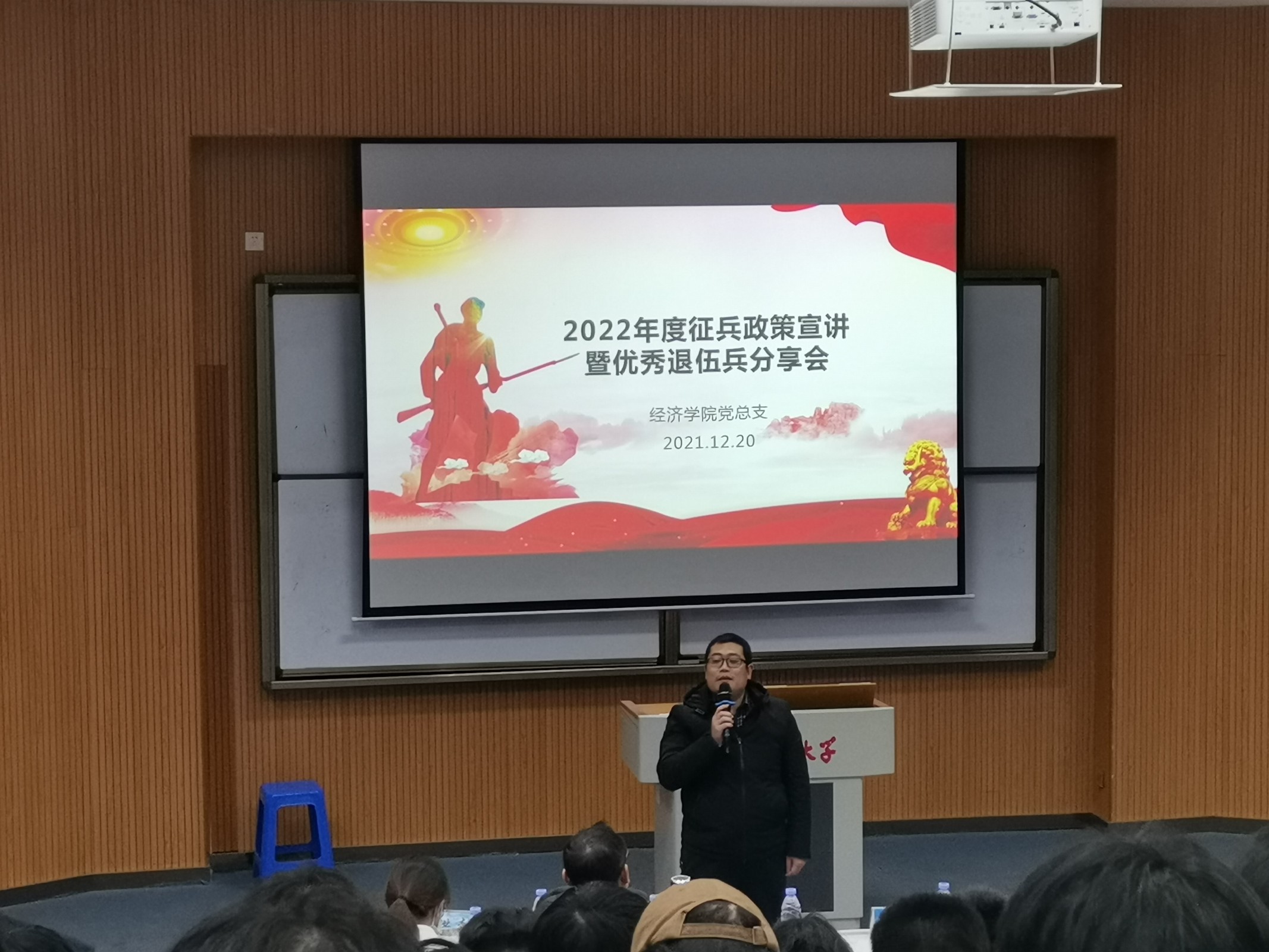 为积极响应大学生征兵政策,激发广大学生的参军热情,2021年12月20日晚,Beat365唯一官方网站党总支征兵宣传会暨优秀退伍兵分享会于新区和昌博雅讲堂举行,Beat365唯一官方网站全体男生参加此次会议。