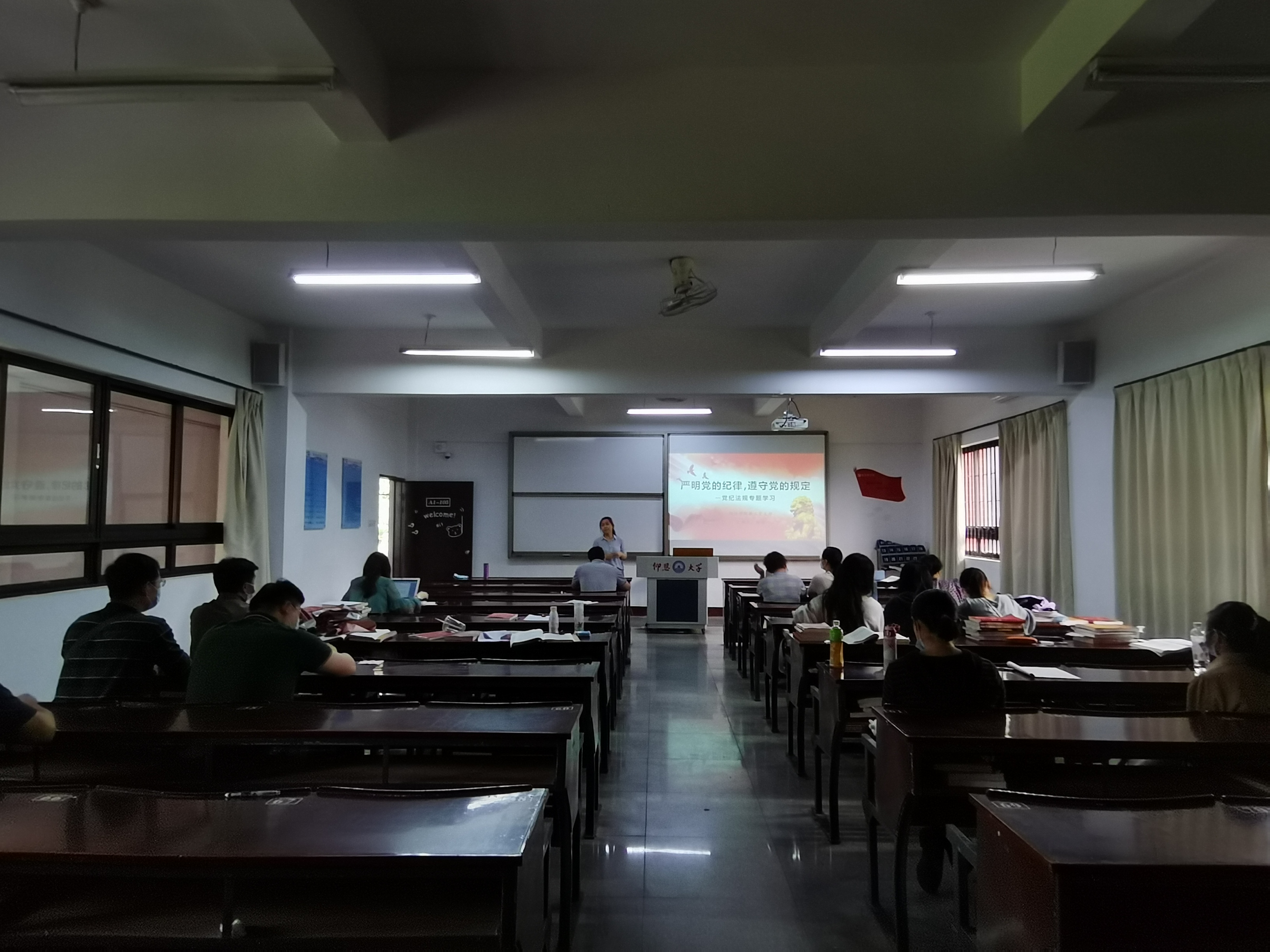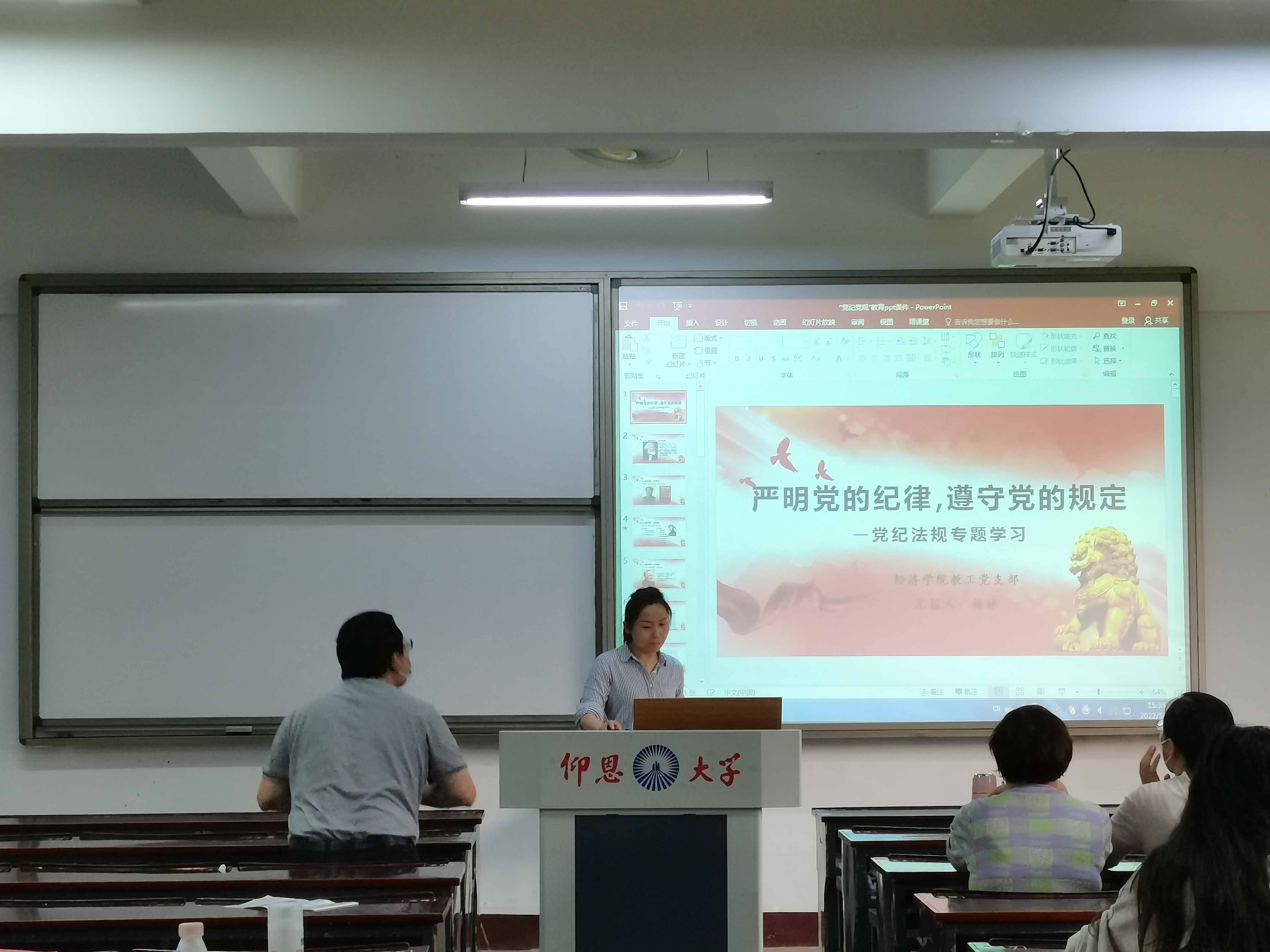 5月25日下午,Beat365唯一官方网站教工支部组织全体党员在仰恩楼A1-105开展党纪党规专题学习,加强教师党员政治纪律教育。此次学习会由支部书记杨娣同志主持。