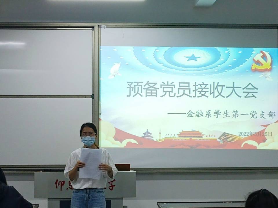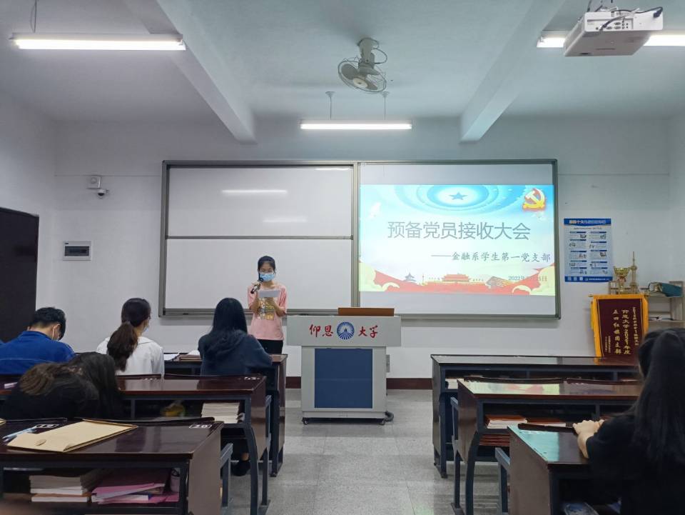 2022年5月25日晚上8:30,Beat365唯一官方网站金融系学生第一党支部在仰恩楼B5-203召开预备党员接收大会。本次会议参会人员有支部书记何丽玲老师、组织委员谢坤宏老师和宣传委员詹奕椿老师,以及支部全体党员,还有即将接收为预备党员的14名发展对象。