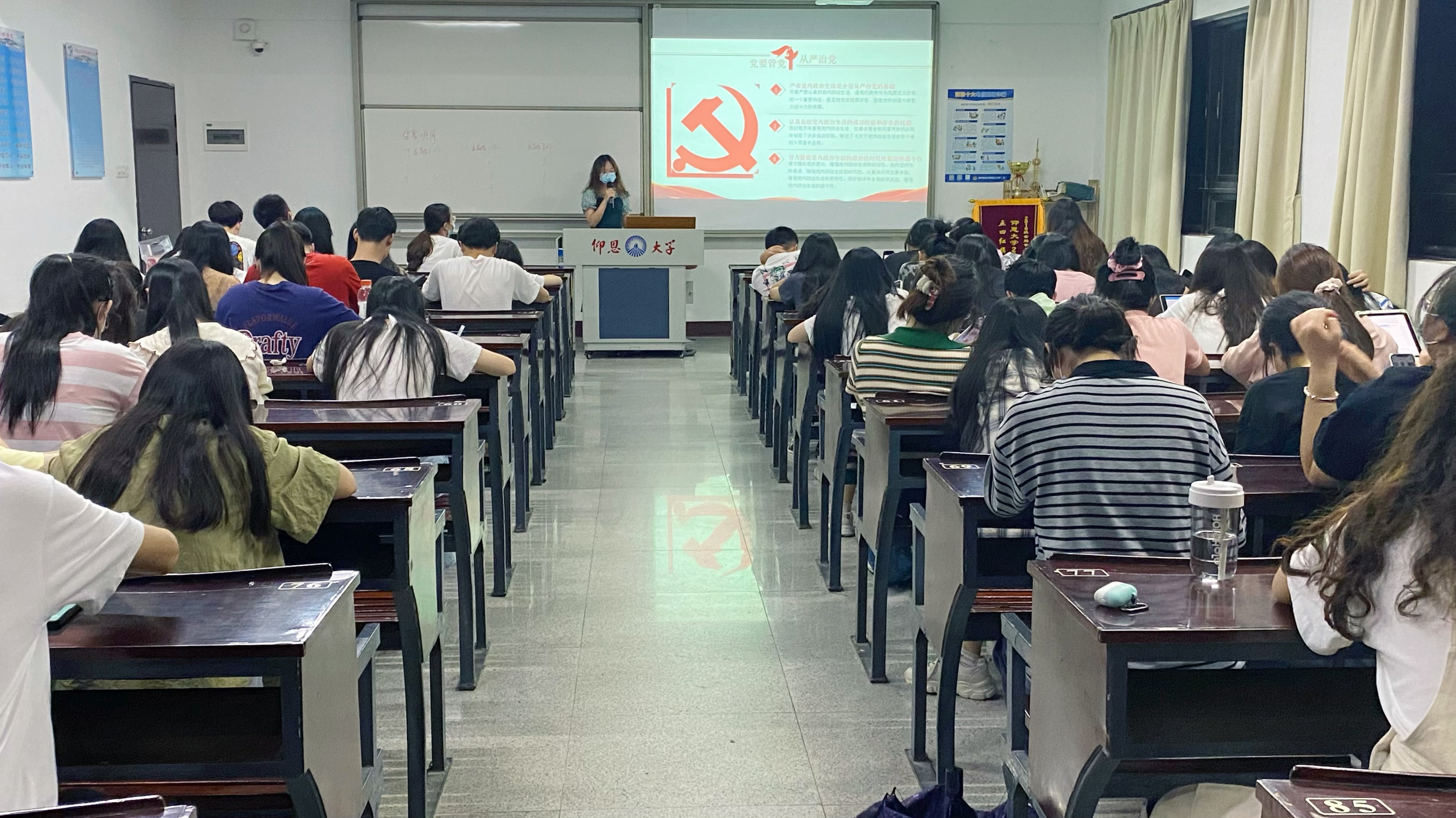 图1 党纪党规学习会开展情况 活动伊始,由各班积极分子代表依次上台发言,以PPT等形式分享学习“党纪党规”的感悟与心得,同学们深刻体会到了党纪党规对于党组织的重要性,意识到党纪党规是永远的戒尺,是全体党员必须遵守的政治要求和行为准则。活动最后,支部书记何丽玲老师对本次学习会进行总结发言,引导全体党员和积极分子践行好党的宗旨,增强党纪党规意识,强化党性修养,为同学们上一堂生动的学习课。