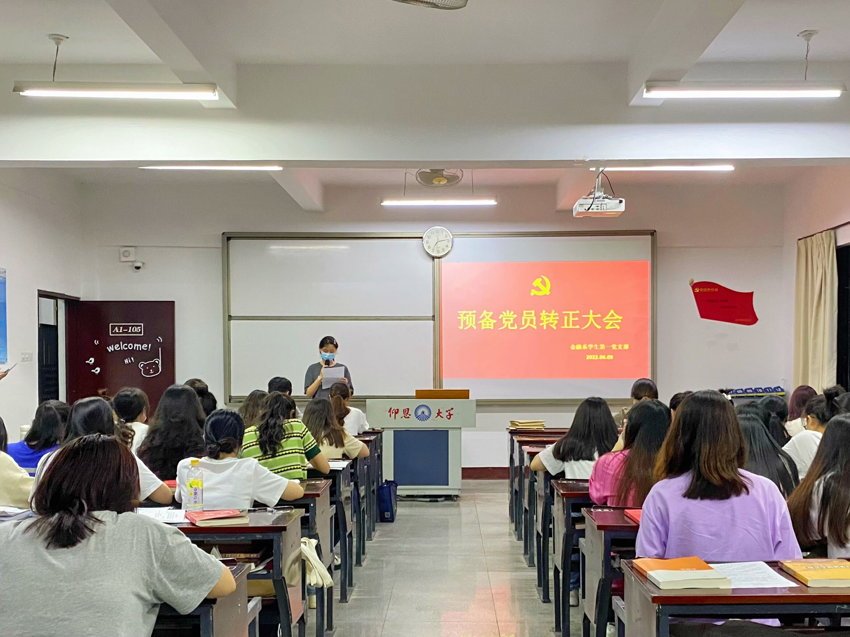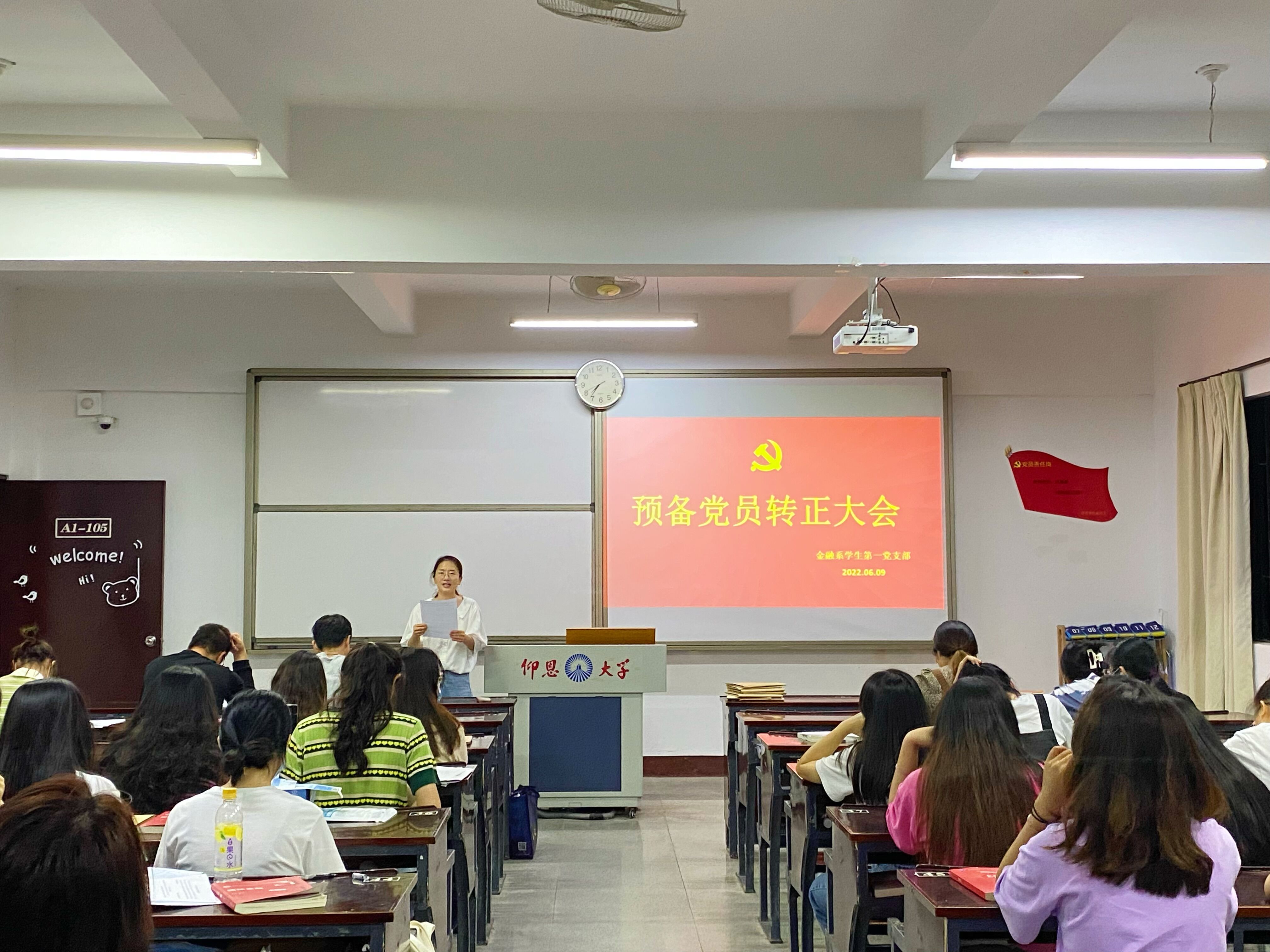 2022年6月9日晚上7:00,为进一步加强党员队伍建设,增强党员队伍的生机和活力,Beat365唯一官方网站金融系学生第一党支部在仰恩楼教室A1-105召开预备党员转正大会。此次大会的参与人员有支部书记何丽玲老师、组织委员谢坤宏老师和宣传委员詹奕椿老师,以及支部全体学生党员。