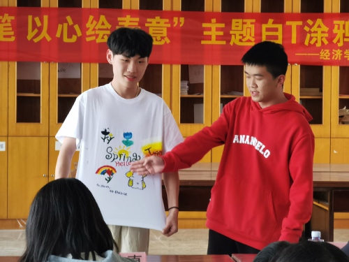 此次手绘涂鸦比赛,以“春”为主题,要求参赛选手就“春”的理解进行创作。在手绘涂鸦创作中,经院学子用他们独特的视角和活跃的思维,认真投入,创作出各具特色、个性鲜明的优秀作品。有温婉细腻,以青草蝴蝶展现春意的盎然;有大胆创新,以色彩碰撞勾勒青春的多彩;有深情告白,以真诚热爱描绘仰恩的可爱。在展示环节中,参赛选手主动将作品穿在身上,热情洋溢地向评委及其他选手展示自己的作品,同时自信昂扬地介绍自己对“春”的理解,分享对未来的勾勒与追求。