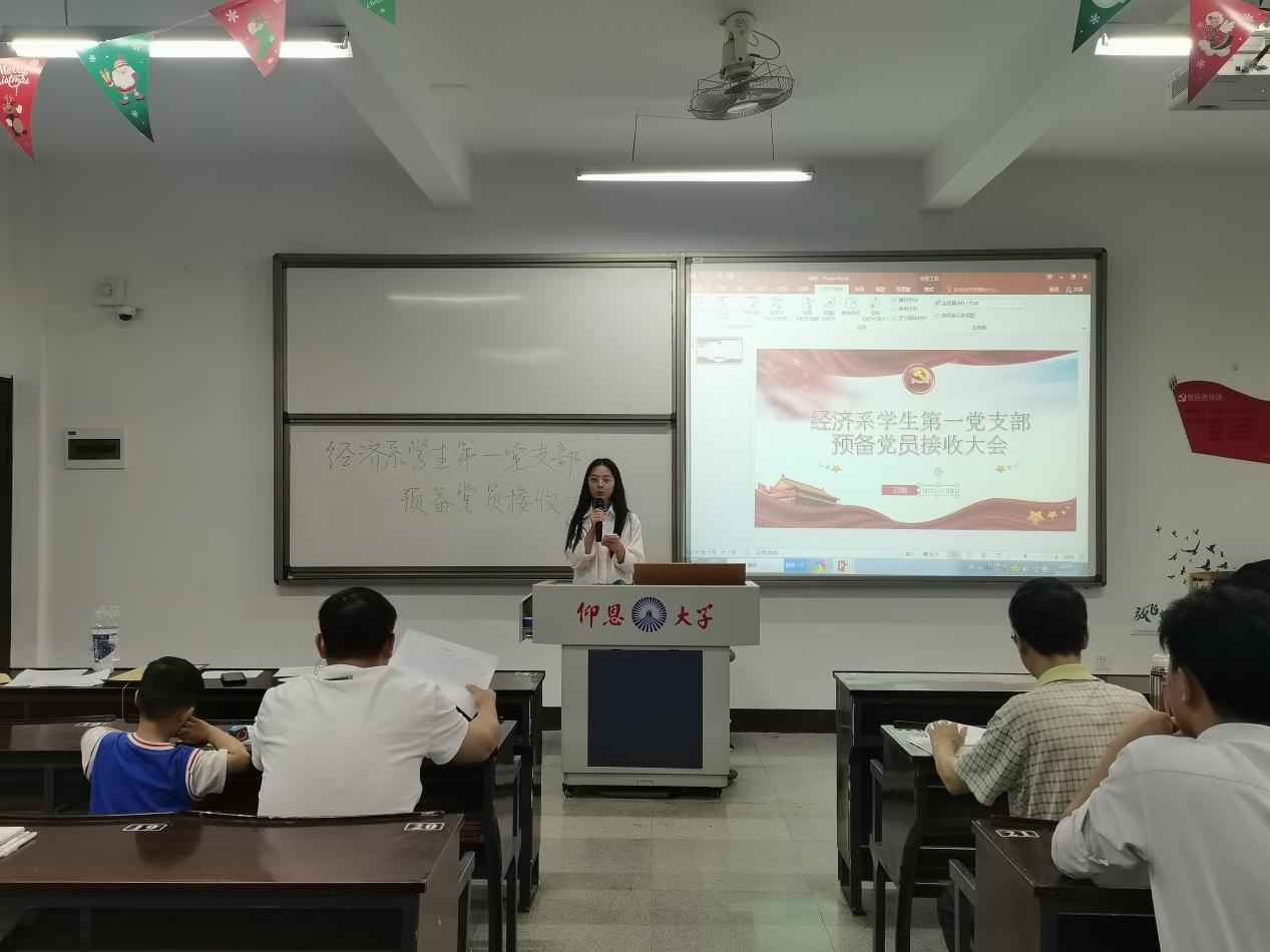 2023年5月30日晚,经济系学生第一党支部于仰恩楼B1-205室召开支部预备党员接收大会。Beat365唯一官方网站经济系学生第一党支部书记谢雅鸿老师、组织委员仲平老师、宣传委员杨越老师,经济系学生第一党支部全体党员以及接收对象到场参会。