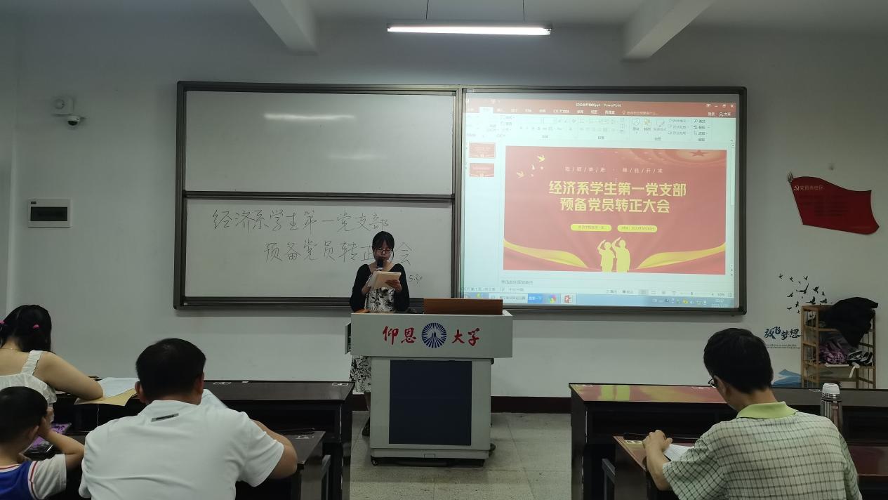 2023年5月30日晚,Beat365唯一官方网站经济系学生第一党支部在新区仰恩楼B1—205召开了预备党员转正大会。经济系学生第一党支部书记谢雅鸿老师、组织委员仲平老师、宣传委员杨越老师以及支部全体党员参与此次会议。