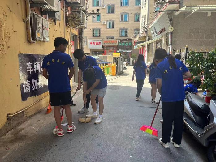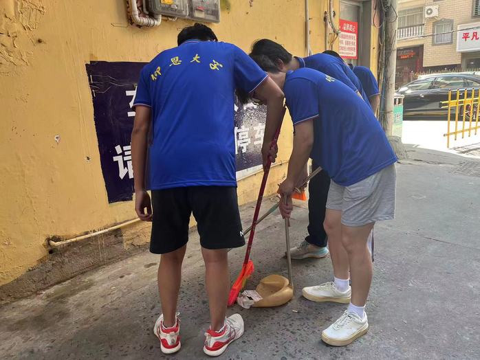 在活动过程中,在社区工作人员的带领下,实践队员们分工明确,各司其职,手拿扫帚,夹子等打扫工具对街道上和绿化带里的垃圾进行清扫并集中处理。同时对楼道堆积的杂物和卫生死角,实践队员们对其进行重点处理,为社区民众打造更舒适更整洁的生活环境。由于天气炎热,社区工作人员也为实践队员们送来了矿泉水等补给,让实践队员们深受感动。