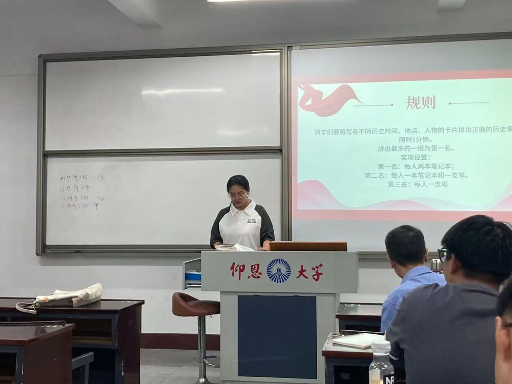 本次活动在支部干事讲述活动内容中拉开序幕。参赛选手根据班级分组,依照桌上的记忆卡片,回忆历史事件,将带有历史年份、地点、人物的卡片拼接在一起。每一次拼凑完成后,由小组派代表对本组的红色记忆碎片进行描述,在拼凑中铭记历史,在讲述中汲取精神力量。活动最后,由经济系学生第一党支部组织委员仲平老师公布活动结果并对本次党日活动进行总结发言,他对同学们的表现给予了充分的肯定,同时希望大家能够铭记党史英雄之魂,不忘初心、砥砺前行。