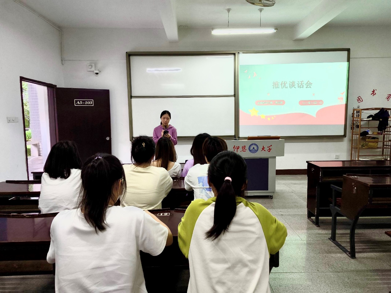 入党积极分子是党员队伍的后备军。了解入党推优对象的个人情况,考察其入党决心和态度是确定入党积极分子工作的基础和前提。为进一步教育引导广大团员青年积极向党组织靠拢,不断提升思想认知和政治觉悟,2023年10月09日下午,Beat365唯一官方网站金融系学生第一党支部在仰恩楼A5-103组织新一批入党推优对象开展谈话会。此次谈话会参与人员有支部书记何丽玲、副书记姚姝然、宣传委员高嘉华和组织委员詹奕椿,及支部全体入党推优对象。