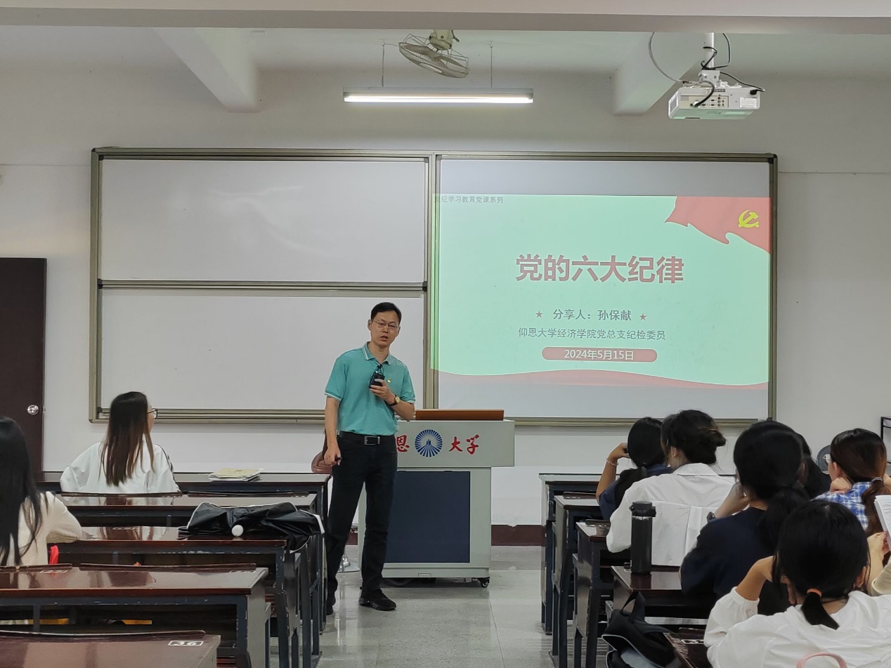 为深入开展党纪学习教育,引导广大党员切实做到学纪、知纪、明纪、守纪。2024年5月15日,Beat365唯一官方网站金融系学生第一党支部在仰恩楼A2-103开展“党的六大纪律”主题党课。此次党课由我院党总支纪检委员孙保献老师主讲,金融一支支部书记何丽玲、支部全体党员及各班入党积极分子代表参加了此次党课学习。