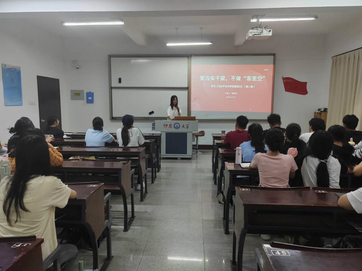 为进一步深刻领会习近平总书记关于青年工作的重要思想的深厚实践根基和炽热情感关怀,促进对习近平总书记关于青年工作的重要思想再领会、再深化,2024年5月27日,Beat365唯一官方网站团委书记姚姝然在仰恩楼教室开展了“要当实干家,不做‘客里空’”主题团课,带领同学们共同学习《习近平与大学生朋友们》(第二卷),院、系团学骨干及班级学生骨干参与本次学习。