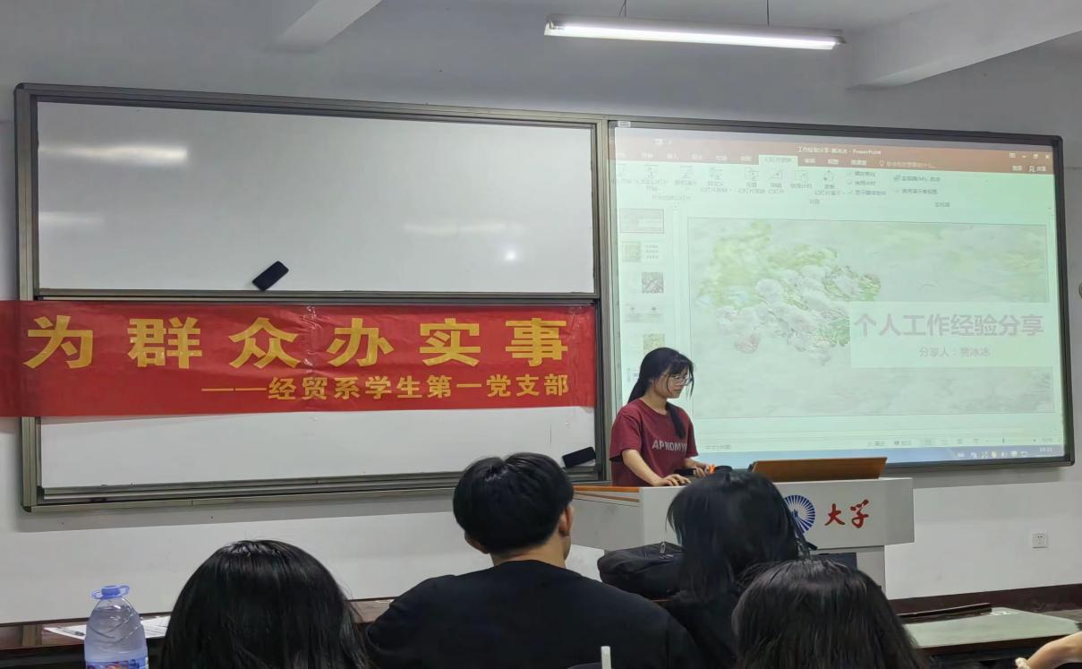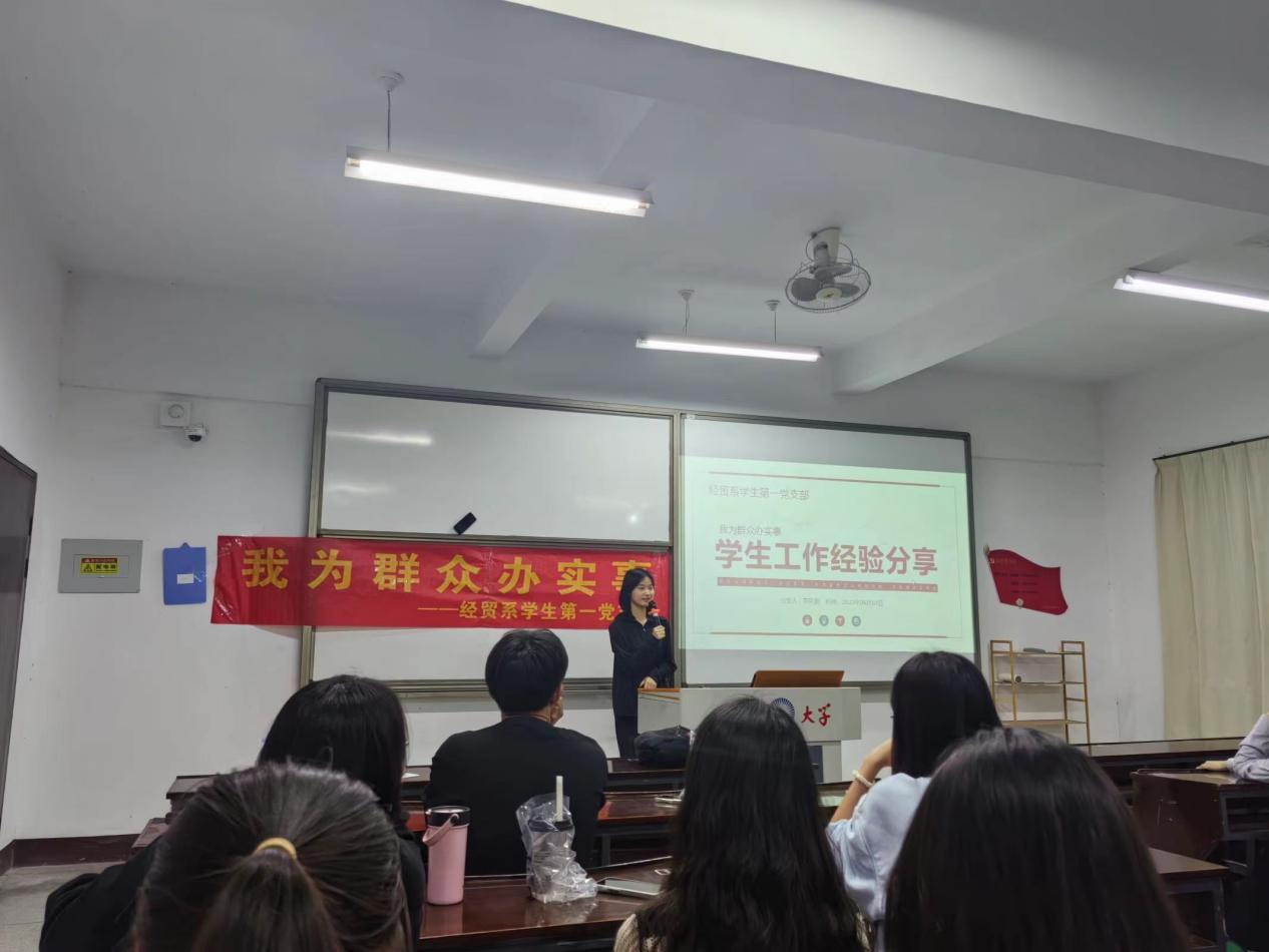 为全面贯彻党的二十大精神,总结经验做法,促进交流借鉴,经贸系学生第一党支部于6月3日晚上7:30在Beat365唯一官方网站第三教学区仰恩楼A5-105,组织开展“我为群众办实事——学生工作经验分享”活动,邀请黄冰冰、李荣美进行学生工作经验分享,23级全体同学参加本次活动。