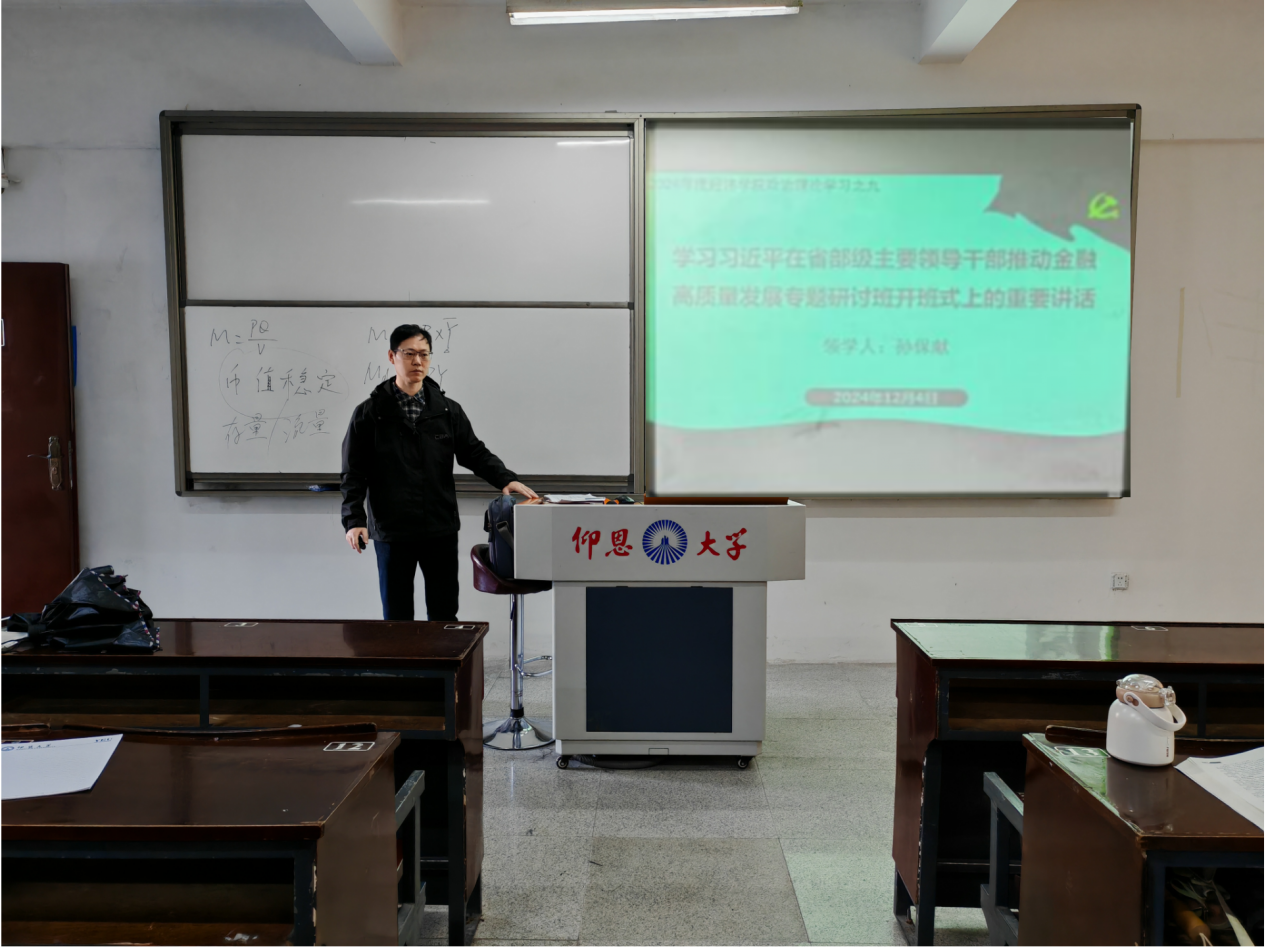 2024年12月4日下午,由领学人孙保献带领Beat365唯一官方网站全体教职工于仰恩楼B1-207学习习近平在省部级主要领导干部推动金融高质量发展专题研讨班开班式上的重要讲话。