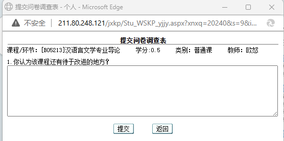 步骤五:对每门课进行评价完成后,点击“提交问卷调查表”, 即可加载相应页面,单击某一课程→任课教师对应的“未评”链接,即弹出“问卷调查”页面,请各位学生认真录入个人意见或建议,单击“提交”按钮即可提交相应的问卷调查表。