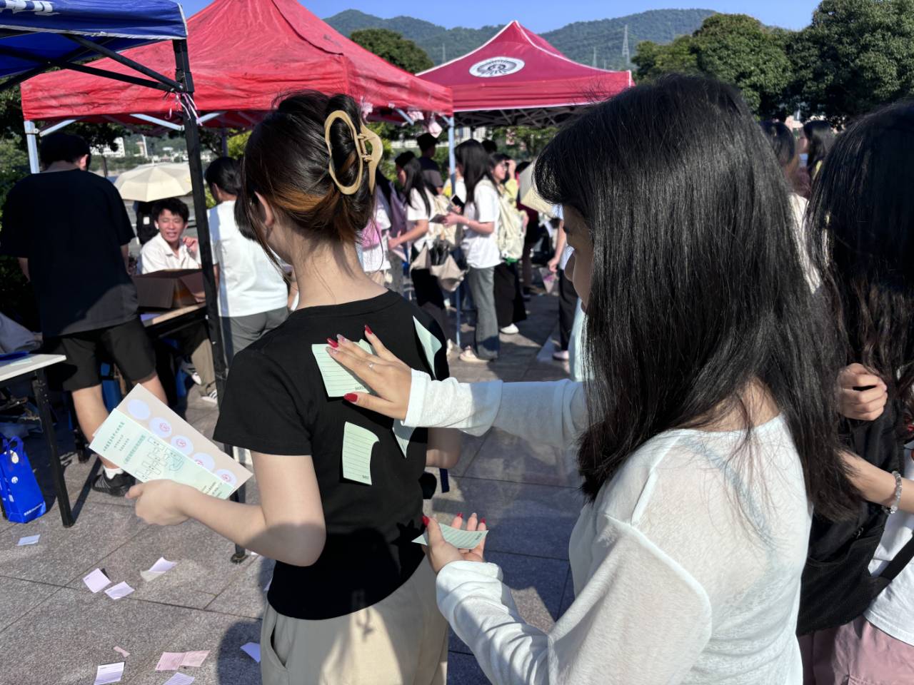 活动筹备阶段工作人员提前到达场地,有序搭建起帐篷,精心布置投壶区域,确保箭和壶的摆放位置精准无误,为参与者营造良好的游戏环境;同时,准备好足量的便利贴,规划好甩便利贴游戏的活动空间。活动现场热闹非凡,投壶游戏区域,同学们有序排队领取三只箭,站在距壶2米的位置,眼神专注,手臂轻轻扬起,将箭投向壶中,每当有箭成功投入,周围便会响起阵阵喝彩;甩便利贴游戏区域,工作人员仔细地在参与者身上贴上5张便利贴,随着计时开始,参与者们尽情摆动身体,或扭动腰肢,或跳跃转身,想尽办法甩掉身上的便利贴,现场欢笑声、加油声此起彼伏。