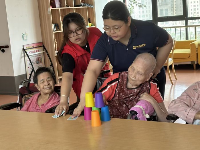 活动主要以投掷乒乓球、纸杯叠叠乐和纸牌翻翻乐等一系列游戏展开,在“纸杯叠叠乐”活动环节,队员们教老人将纸杯交错叠放以保持平衡,凝神聚力地堆叠出爷爷奶奶们的成果;在“纸牌翻翻乐”游戏中,爷爷奶奶老人们之间进行组队考验记忆反应,记错牌面的轻声调侃满是温情,一起复盘“策略”拉近彼此距离。