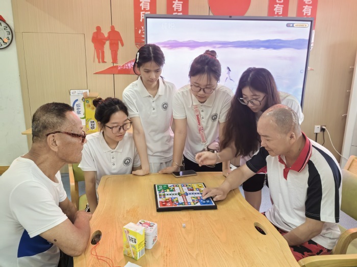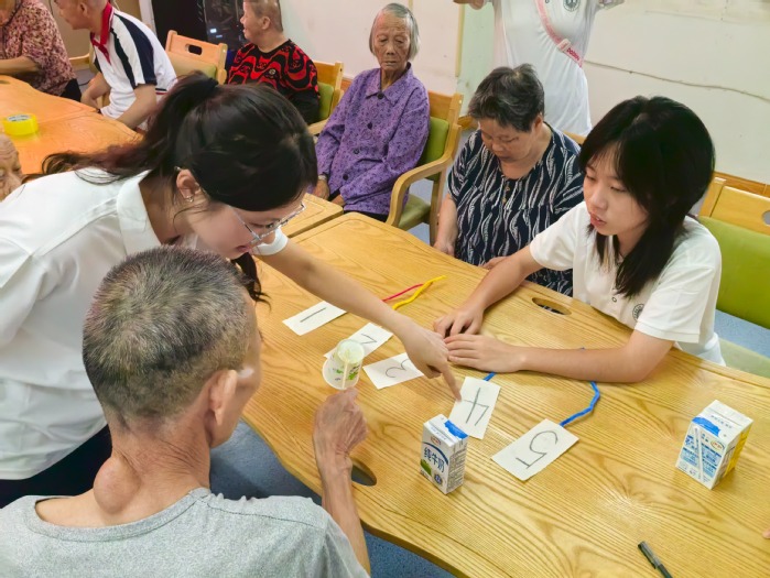 活动开始,队员一字一句陪老人们共唱《国家》,家国情怀跨越年龄,弥合时代代沟,拉进彼此间的距离。在随后的数字接力、瓶盖夹取等多项游戏,老人们更是在实践队员们的活力鼓舞下不断尝试挑战,满是欢声笑语。最后,队员围坐老人身旁,聆听往昔、分享琐事,言语温暖拉近心灵距离。