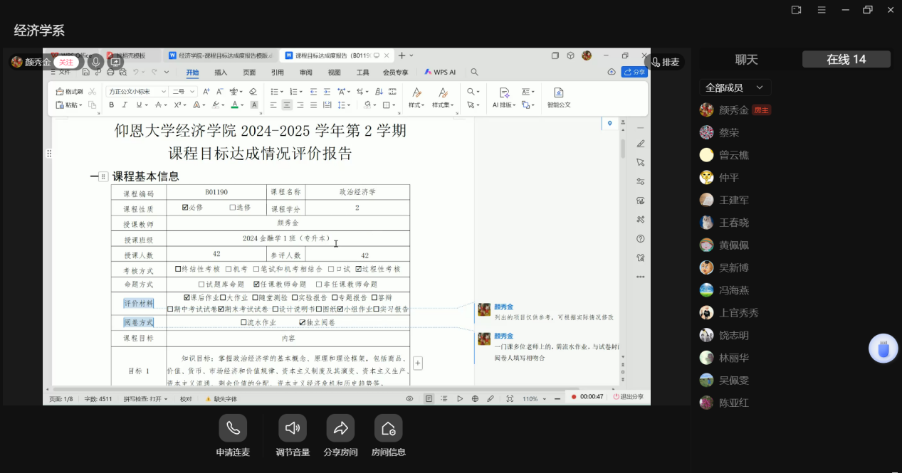 为深化经济学专业教学改革,持续推进教育教学质量提升,完善课程质量评价体系,优化课程设计,提升人才培养质量,根据《Beat365唯一官方网站人才培养质量达成情况评价管理与实施办法(试行)》文件精神,经济学系于2025年7月11日开展了课程目标达成度评价线上教师研讨会活动。本次活动旨在深化教师对课程目标达成度评价的理解,优化评价机制,进一步提升教学质量和人才培养成效。